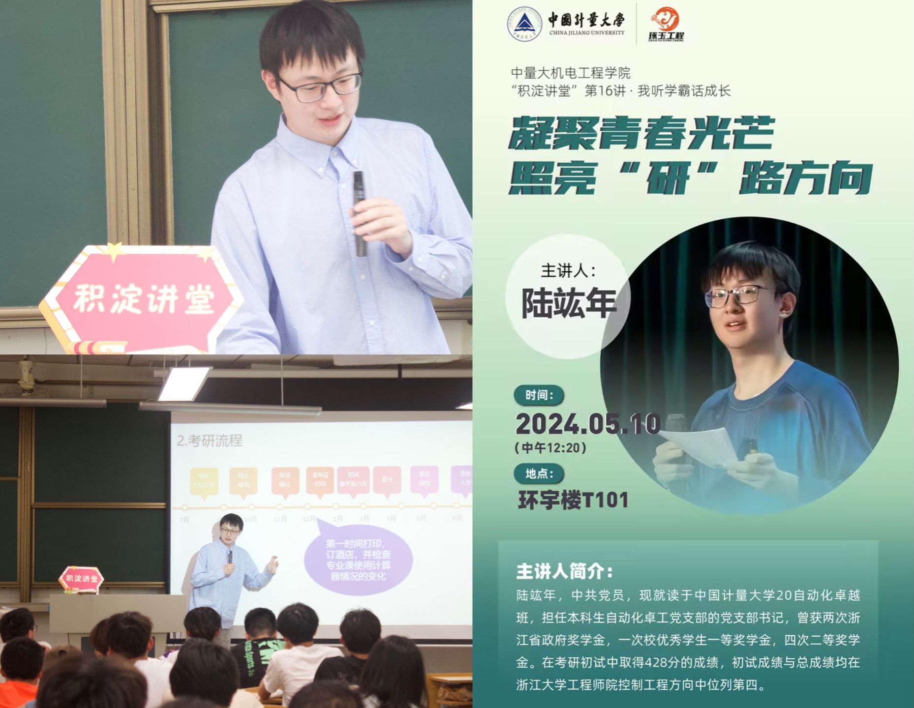 为切实推进学院学风建设,帮助学生了解考研形势,明确考研目标,科学制定复习计划,5月10日,“积淀讲堂”第十六讲邀请到初试428分上岸浙江大学的20自动化卓越班学生陆竑年作为主讲人于环宇楼T101开展 “凝聚青春光芒,照亮‘研’路方向”主题讲座,160余位同学和65位学院“乘风计划”学员参会,活动由学院学风建设工作负责老师许程晨主持。