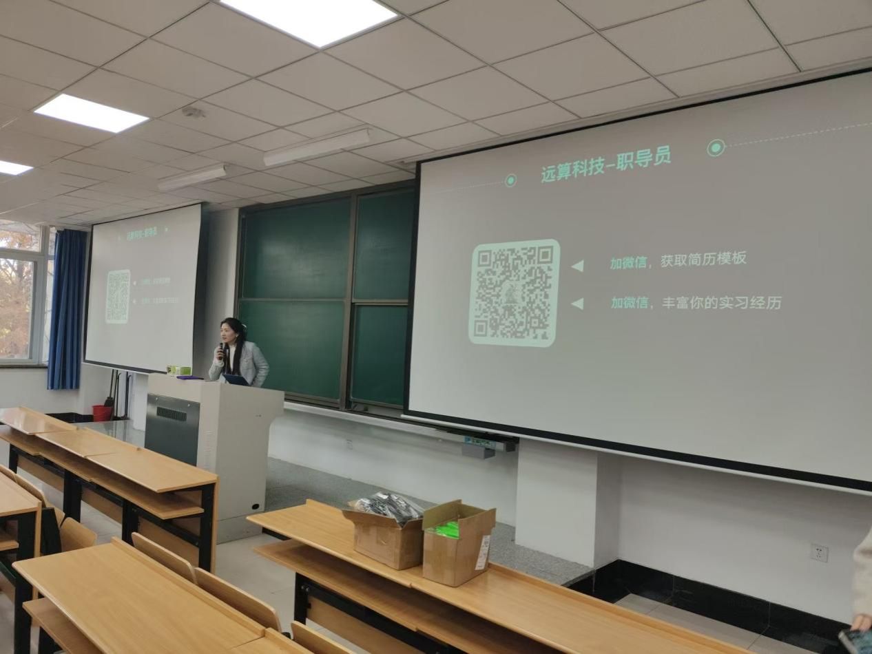 当天下午两点整,宣讲会准时开始,教室内座无虚席,来自机电的学生们满怀期待地等待着这场知识与梦想的碰撞,宣讲会由浙江远算科技有限公司人力资源部钟项莉主持,她简要介绍了远算科技公司的发展历程、企业文化、核心业务及行业地位;随后,来自技术研发、市场营销、人力资源管理等多个部门的资深员工上台,通过生动的案例分享、互动问答等形式,深入浅出地介绍了各自岗位的工作内容、职业发展路径。这些来自一线的真实声音,不仅让学生们对职场有了更加直观的认识,也激发了他们对未来职业生涯的无限遐想。