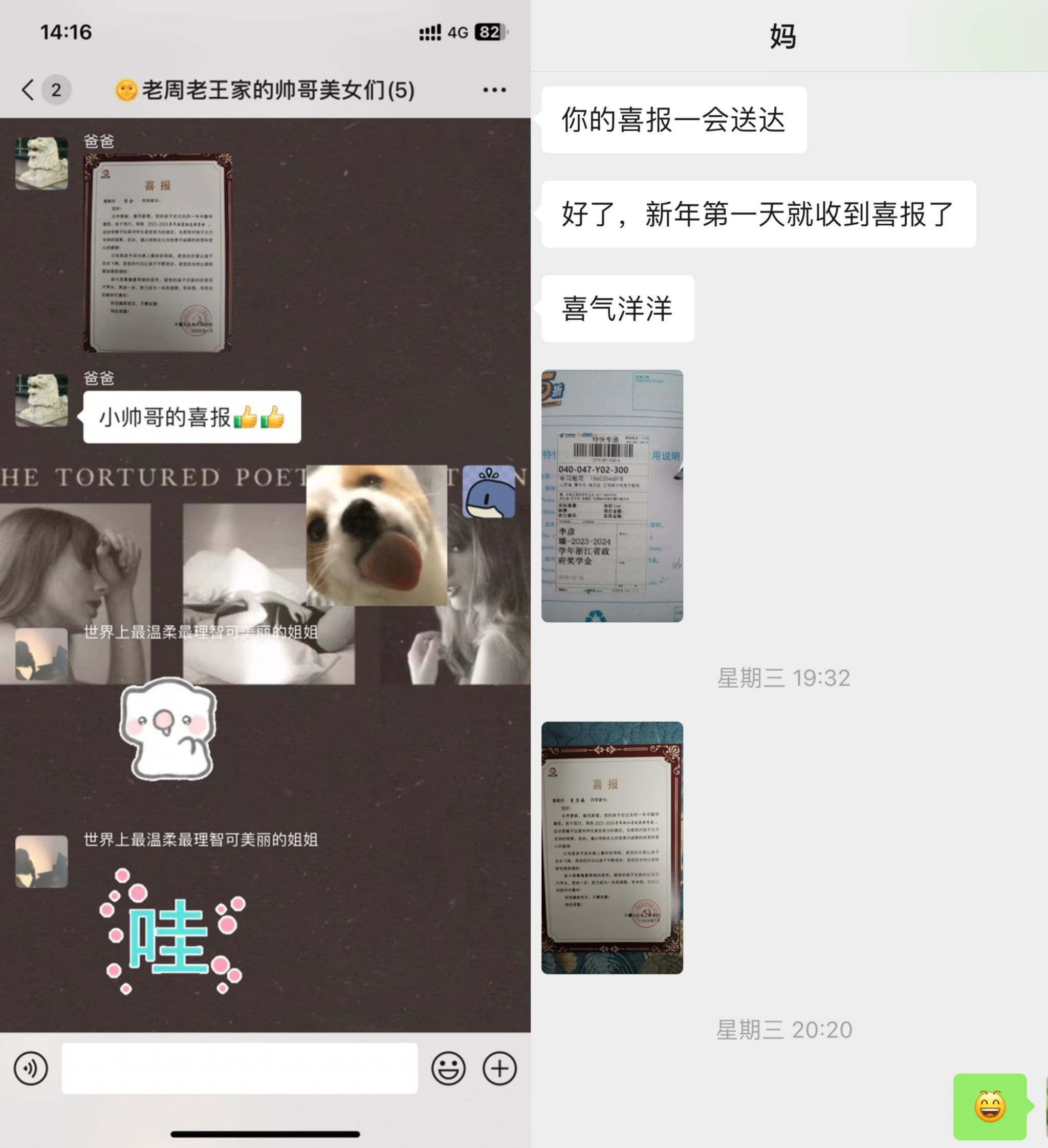 当父母收到喜报时,他们的喜悦透过手机屏幕,清晰的展现在我眼前。这份喜报不仅为我家带来温暖,也让我感到学院对我过去努力的肯定,它如同一束光,照亮了我前行的道路,让我更加坚定了追求知识的决心。