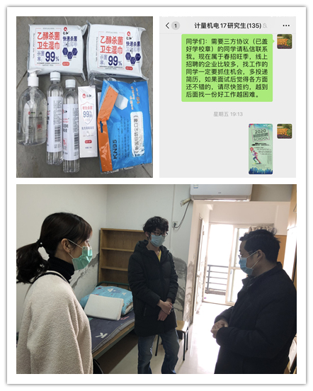 学院十分关注重疫区特别是湖北籍同学以及滞留湖北的同学情况和动向以及当地疫情,建立畅通的联系,做好安抚、了解困难、鼓励信心、传递学校关怀,6个在湖北的同学都能以积极的心态居家做好自我防护。在快递能寄达湖北的第一时间,学院购买了一批消毒液、酒精、洗手液、湿巾、口罩等防疫物资寄给湖北的同学,给他们送去更多的防护。还有1个湖北籍研三学生吴鑫留校至今,近期学院党委书记朱兆武、副书记杨玉书和辅导员陆维维到学校生活区宿舍慰问了吴鑫,并给他带去了一些生活用品。朱兆武表达了学院对吴鑫的关心,询问他目前写论文和找工作的进展,鼓励他每天规律作息、坚持锻炼,争取早点完成论文和答辩。