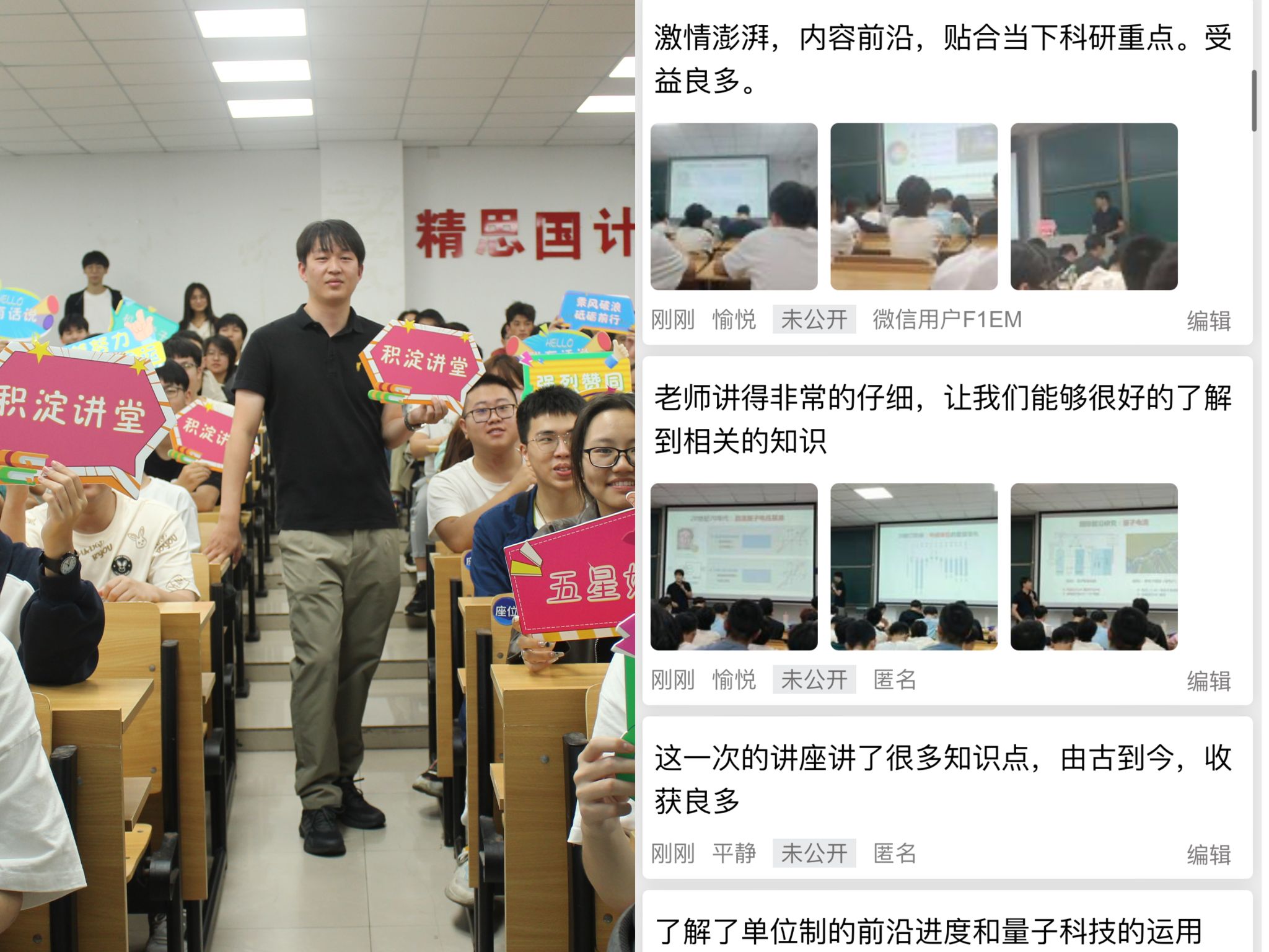 整个讲座过程中,钱璐帅紧紧围绕“量子电学计量”这一中心,结合自身的科研经历和实践经验从“国际单位制变革及电学计量发展简史”、“国际单位制变革对电学计量的影响”、“我国的量子电学计量研究与发展”和“电学量子计量的国际前沿研究”四个方面给同学们介绍了计量1.0到计量4.0之间的变化,量子电压、量子电阻的最新研究与应用等内容。钱璐帅用生动的案例、详实的数据、幽默的语言给在座的同学们上了一堂别开生面的学术交流课。