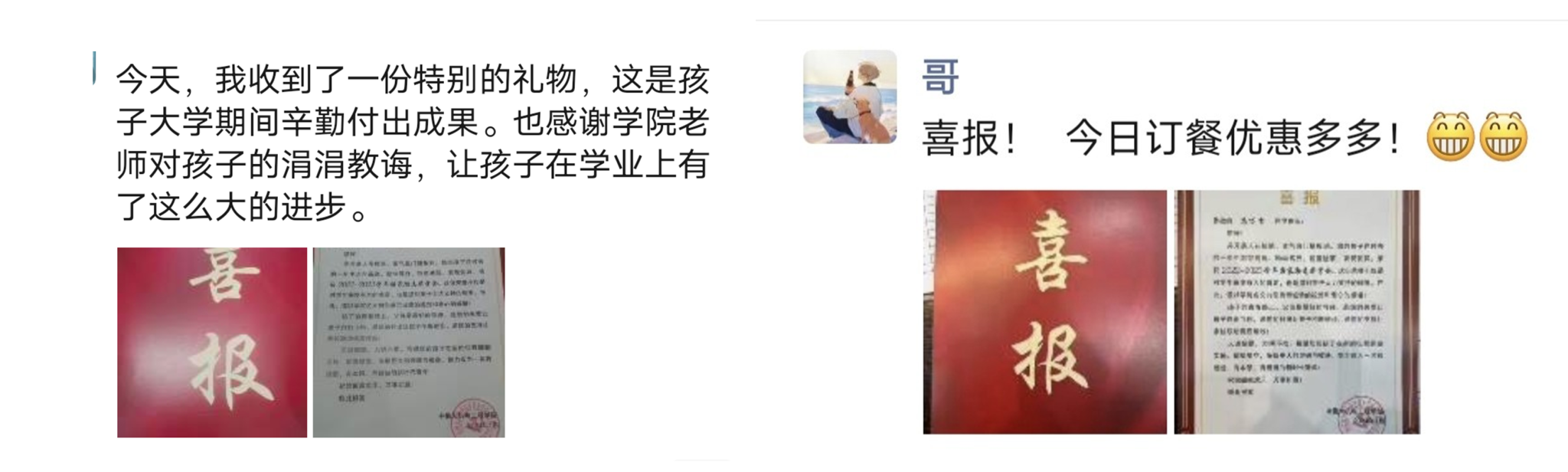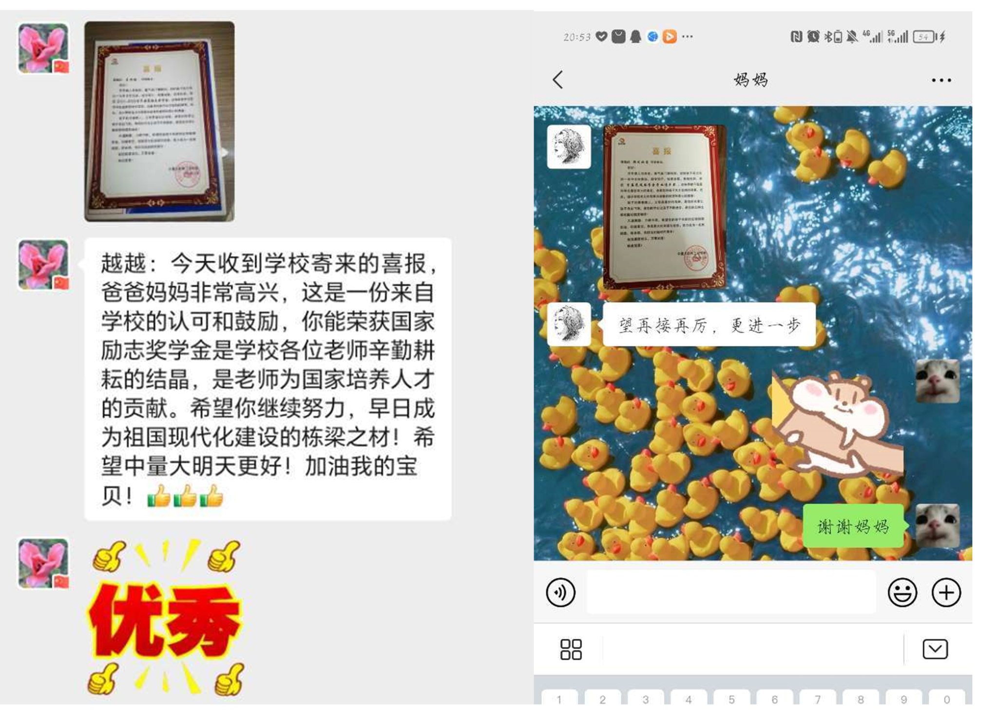 大学以后由于不在父母身边,缺乏与他们的沟通交流,通过这次发送喜报的活动,向他们展示并证明我有在大学好好努力,这加强了家庭亲密度,也激励着我更加努力学习,希望这个活动可以一直办下去。
