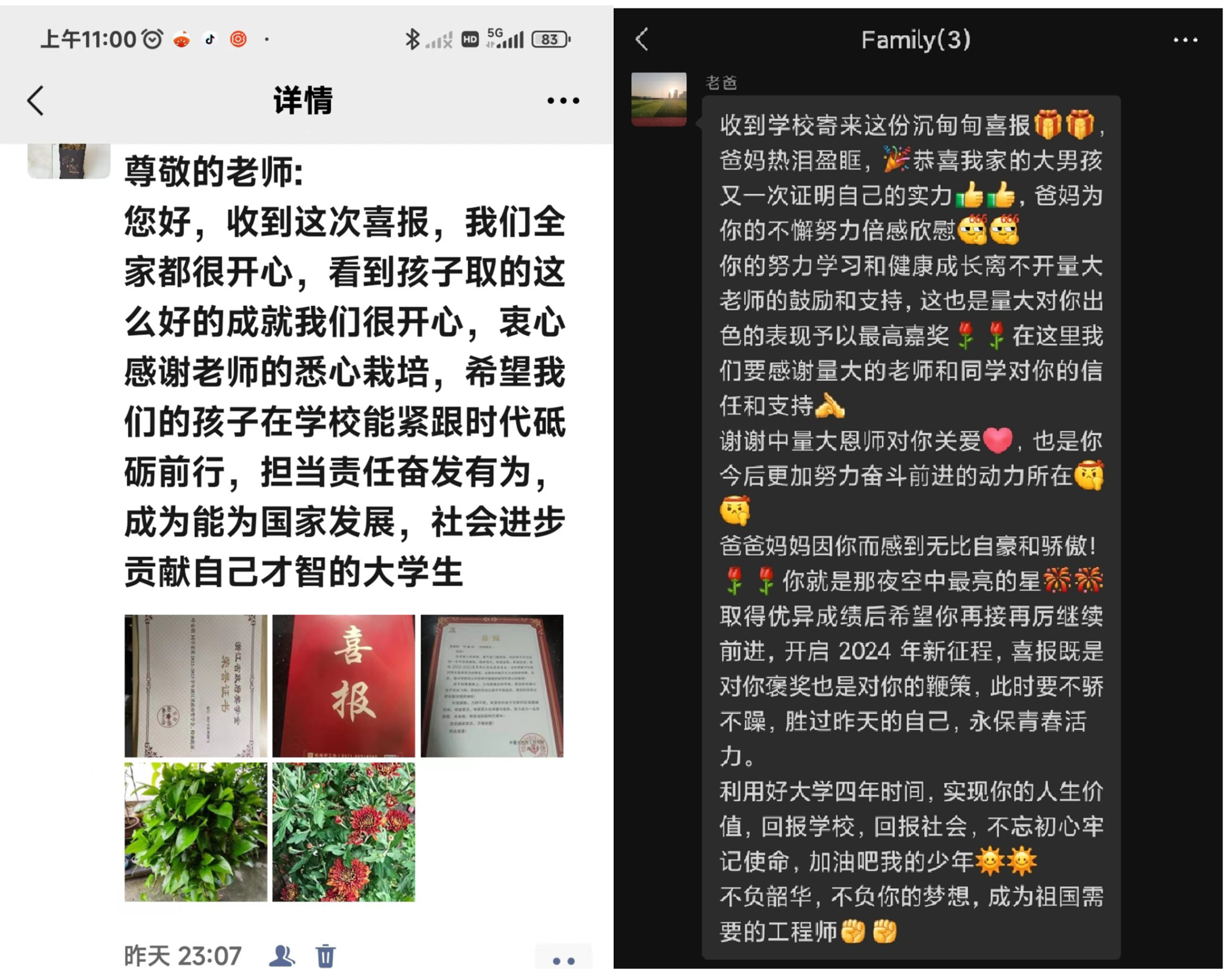 2023年我获得了一些成绩,正在琢磨怎么将这个好消息传达给家人的时候,学院有了这个寄送喜报的活动,家里人收到后也给了我很大的鼓励,通过打视频我能够看出父母非常高兴,感谢这个活动。