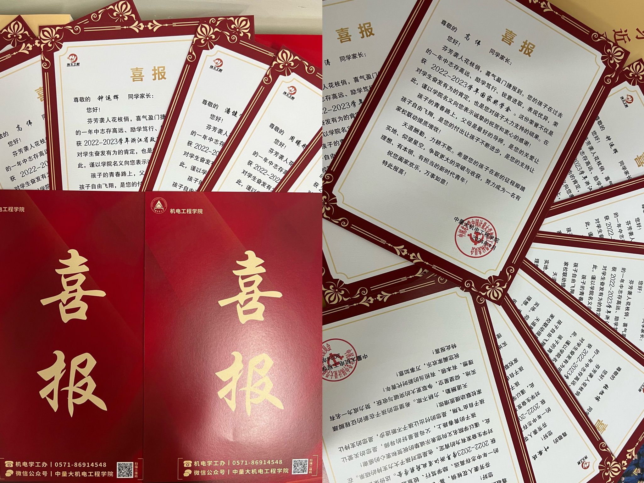 为进一步搭建家校联动育人平台,在家校共育中凝聚思政育人合力,机电工程学院近期面向2023年度国家奖学金、国家励志奖学金、省政府奖学金、第六届“积淀先锋”以及首届“乘风奖学金”学业进步奖获得者家庭邮寄喜报,开展“喜报传佳音”活动。