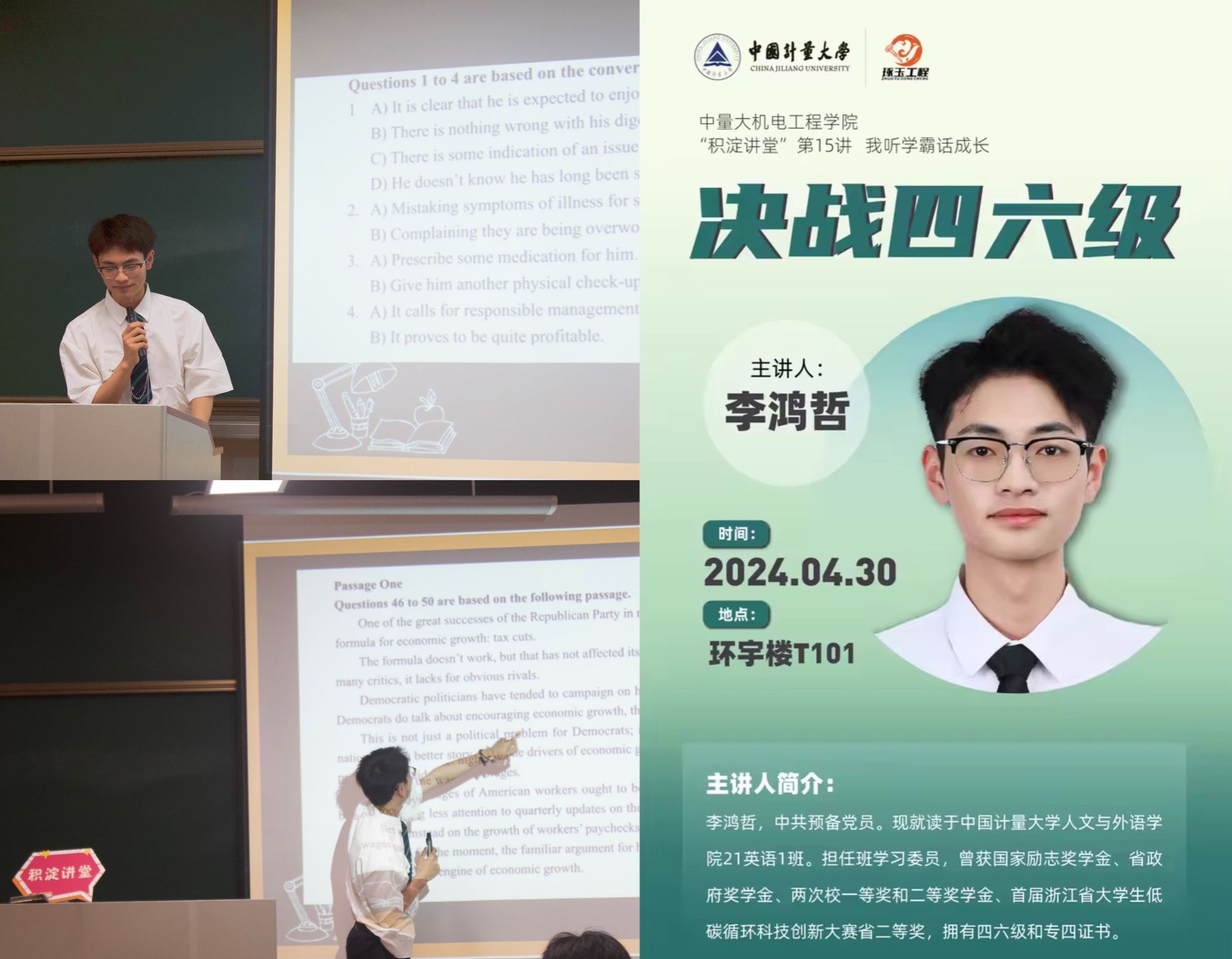 为帮助我院学子掌握高效实用的大学英语四六级备考技巧,科学规划复习路径,营造良好的英语学习氛围,4月30日,“积淀讲堂”第十五讲邀请到省政府奖学金获得者、人文与外语学院21英语1班李鸿哲作为主讲人于环宇楼T101开展“玩转四六级”主题讲座,150余位低年级学生和66位学院“乘风计划”学员参会,活动由学院学风建设工作负责老师许程晨主持。