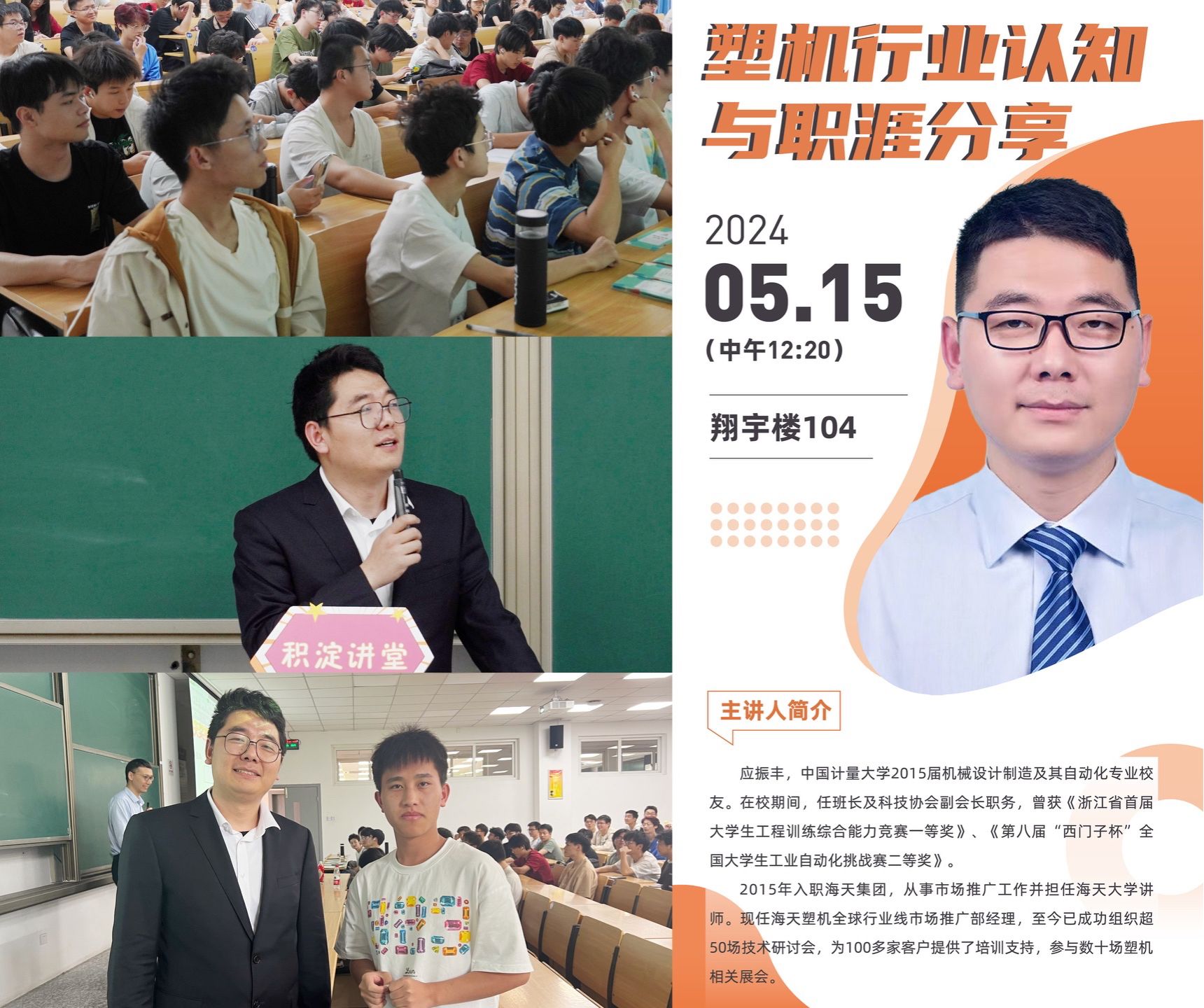 为进一步提高大学生职业规划意识,帮助低年级同学了解智能制造领域行业现状,充分发挥优秀校友的榜样引领作用,5月15日,“积淀讲堂”第十七讲邀请到2015届机械设计制造及其自动化专业校友、现任海天塑机全球行业线市场推广部经理应振丰作为主讲人于翔宇楼104开展 “塑机行业认知与职涯分享”主题讲座,130余位低年级同学和56位学院“乘风计划”学员参会,活动由学院学风建设工作负责老师许程晨主持。