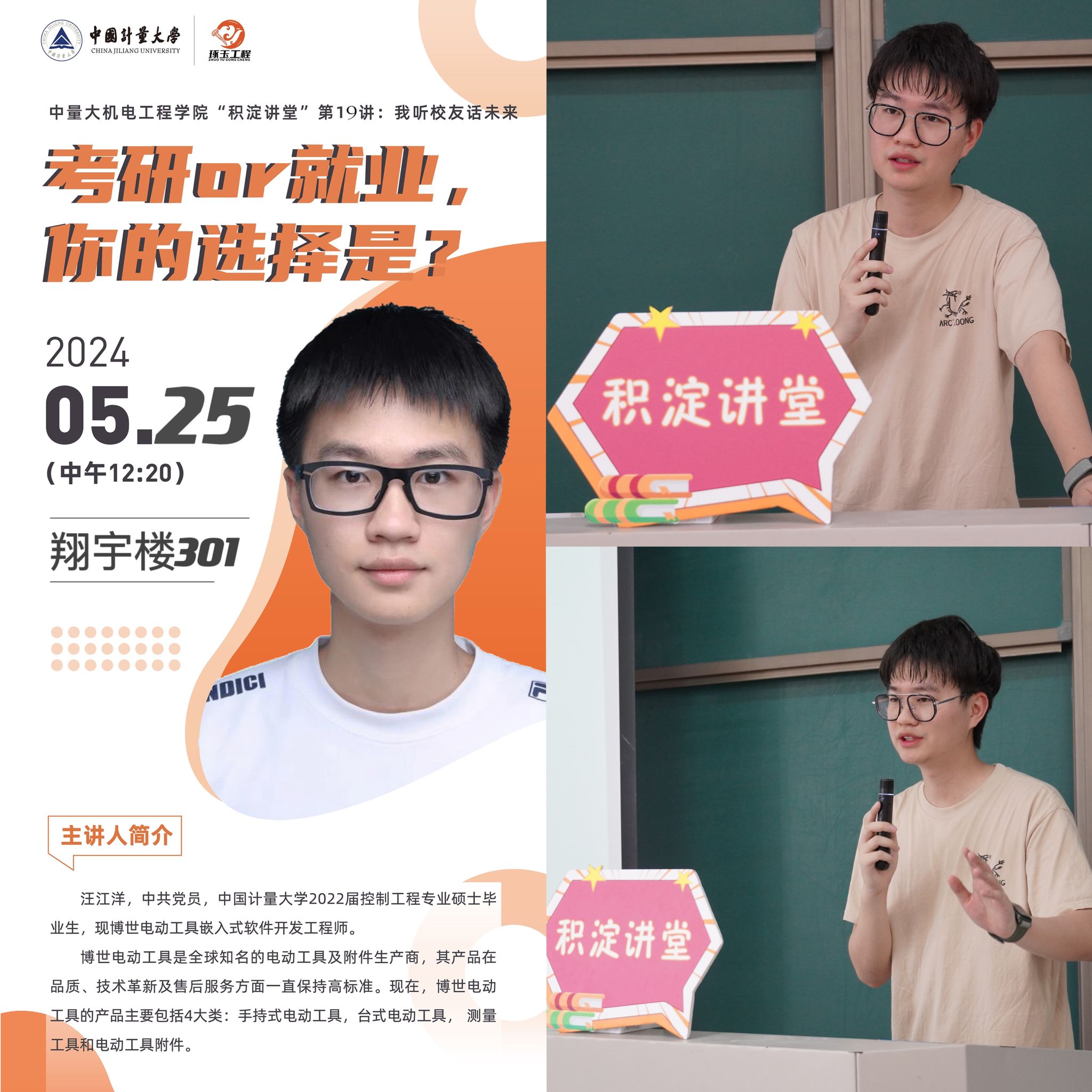 选择考研还是就业,这是一道摆在每一位大学生面前的难题,为了帮助学生更好地规划未来,明确自己的职业发展方向,5月25日,“积淀讲堂”第十九讲邀请到2022届控制工程专业校友、现博世电动工具嵌入式软件开发工程师汪江洋作为主讲人于翔宇楼301开展 “考研or就业,你的选择是?”主题讲座,86位低年级同学和21位学院“乘风计划”学员参会,活动由学院学风建设工作负责老师许程晨主持。