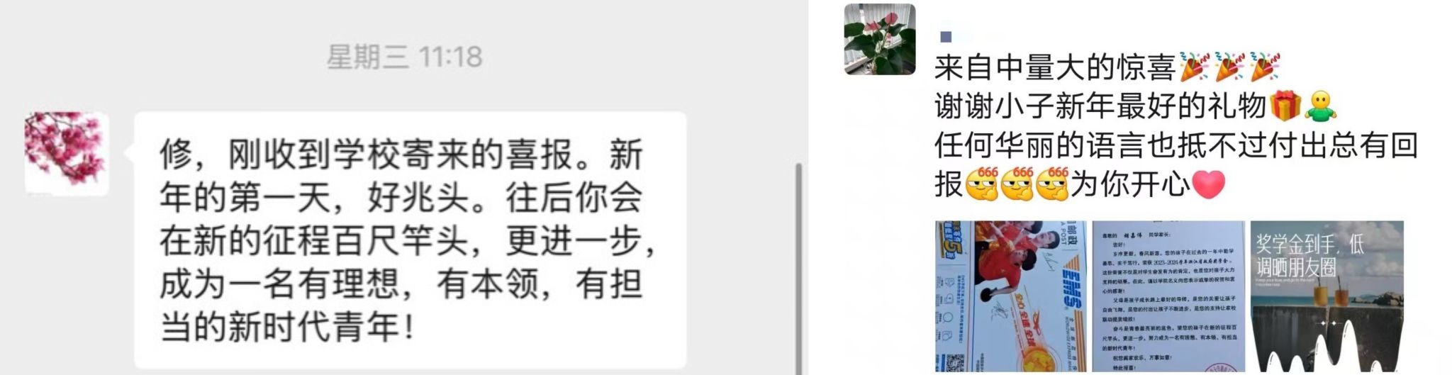 当爷爷在老家收到这份国家励志奖学金的喜报时,他迫不及待地细细研读起来,脸上洋溢着无比的欣慰与骄傲。衷心感谢学院举办的这次活动,让远在家乡的亲人分享我的努力与成长,这也激励着我将继续勇敢前行!