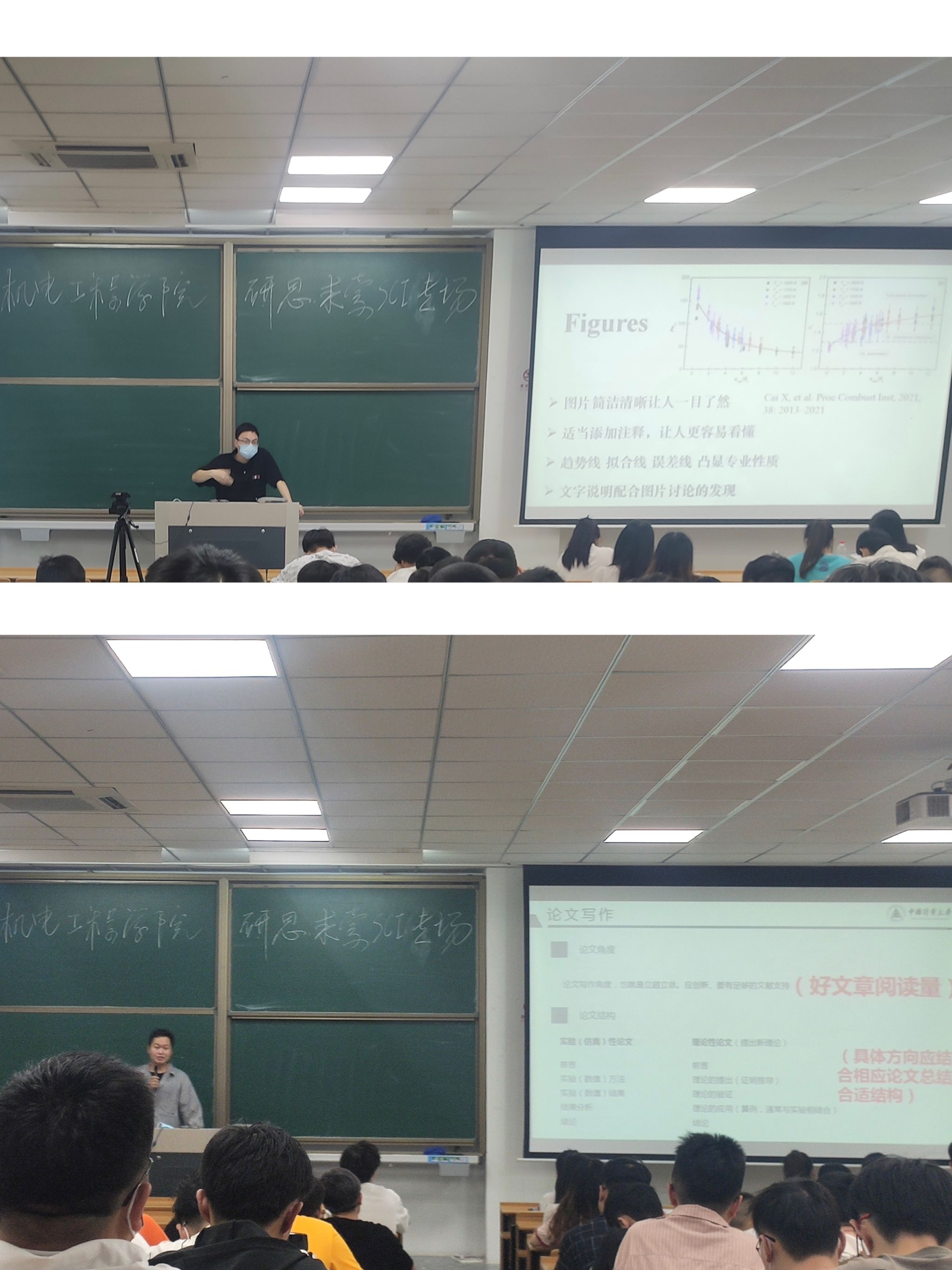 褚贵东从论文结构出发,详细讲解实验(仿真)性论文和理论性论文(提出新理论)的结构组成,鼓励同学们要在足够的工作量的前提下明确研究目的,充分地展示研究结果和结论,论文观点中要注重量化分析。汪迁文从SCI论文写作的脉络出发,首先与同学们分享一些写作中实用的工具,例如作图工具常用的有Origin,Solidworks ,文献引用常用工具有Mendeley,Endnote 等等,接着他从摘要、引言、正文部分、参考文献等论文写作撰写方面中容易出现的问题做了详细讲解,提醒同学们在论文写作的过程中找到创新点,并围绕创新点撰写,逻辑不能乱,要层层递进、条理清晰。