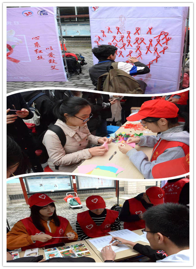 活动当天,志愿者们向师生发放了“防艾”宣传单,呼吁现场师生齐心协力普及防艾知识,认真践行红丝带精神。同时,现场的许多师生通过写明信片、拍视频、制作折纸等形式表达自身对艾滋病患儿的鼓励与支持,为“红丝带”学校的儿童送上自己的爱心,送去温暖与祝福。每有一位同学奉献爱心,宣传板上便会贴上一条鲜艳的红丝带,随着同学们的积极参与,红丝带渐渐组成了一个爱心,让爱与温暖萦绕于心。