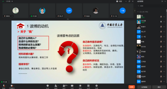 线上交流中,乔文通从自身经历出发,详细讲述了自我读博动机的转变以及申博的过程,从摇摆不定、怀疑自我能力到明确目标、坚定读博信念,从了解申博常识到收到博士录取通知,他用自身不算顺利的申博历程来提醒有意读博的师弟师妹们尽早着手准备,注重平时积累,丰富知识储备,在硕士期间多发表高水平论文,做好科研工作。当下正在申请博士的朱旭凡则从申请材料的准备、研究计划的撰写、选择学校和导师的经验、联系导师应注意的事项以及本校博士招生政策等五个方面进行了详细说明,鼓励同学们深入参与导师的科研项目,夯实科研创新能力。