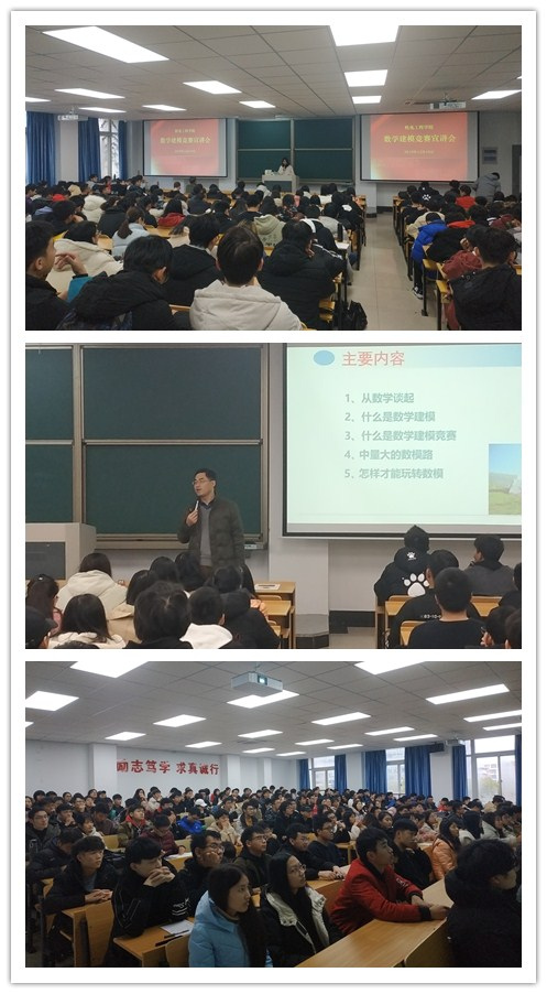 会上,王义康老师首先从“数学”谈起,以高炉炼铁、烧菜及三村短路等与生活息息相关的问题引入,介绍了“数学建模”的含义及应用,在“内容与形式”、“评阅的标准与宗旨”等方面对“数学建模竞赛”作了说明,并向同学们介绍了我校数学建模的盛况、加入数模团队的途径以及数学建模对考研就业等方面的重要性。整场讲座气氛热烈,王义康老师饱满的激情、幽默诙谐的语言风格、有趣的现场互动迎来了同学们的阵阵掌声。