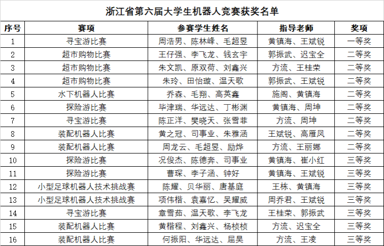近日,浙江省第六届大学生机器人竞赛在在杭州职业技术学院举行,我校共有42名学生组成的16支队伍参加,共摘得省一等奖1项,省二等奖8项,省三等奖7项,参赛队伍均在比赛中获奖,创我校在该项赛事中的最好成绩。