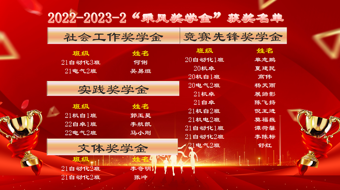 为加强资助育人工作的顶层设计,不断完善学院资助育人工作体系,鼓励学院家庭经济困难学生勤奋学习,积极参加社会活动,培养学生实践精神和创新能力,机电工程学院为全日制本科家庭经济困难学生单独设置了“乘风奖学金”。