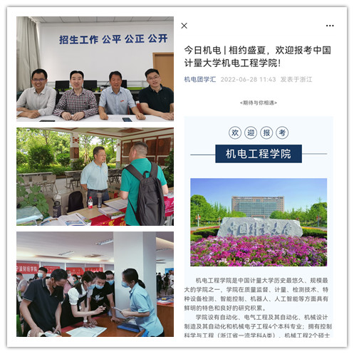 高考前,学院重新梳理学院简介和专业介绍,及时更新学院官网信息,帮助考生和家长全面、准确了解机电工程学院;学院院长、专业负责人与考生和家长相约线上,畅谈机电工程学院以及报考机电学院4个本科专业的优势。高考成绩出来后,学院积极主动对接所联系温州片区的15所高中,第一时间寄送学校招生宣传材料,同时,第一时间组建起由专业负责人、学科专任教师、辅导员、教务员等组成的招生宣传小分队,7个小分队深入温州8所高中开展现场招生宣传,为学校争取优质生源出力。与此同时,学院通过“机电团学汇”和“机电工程学院”官方微信公众号推出机电招生季专题推送,帮助考生了解中量大,走进机电学院,尽最大努力吸引全国各地优秀学子报考我校。