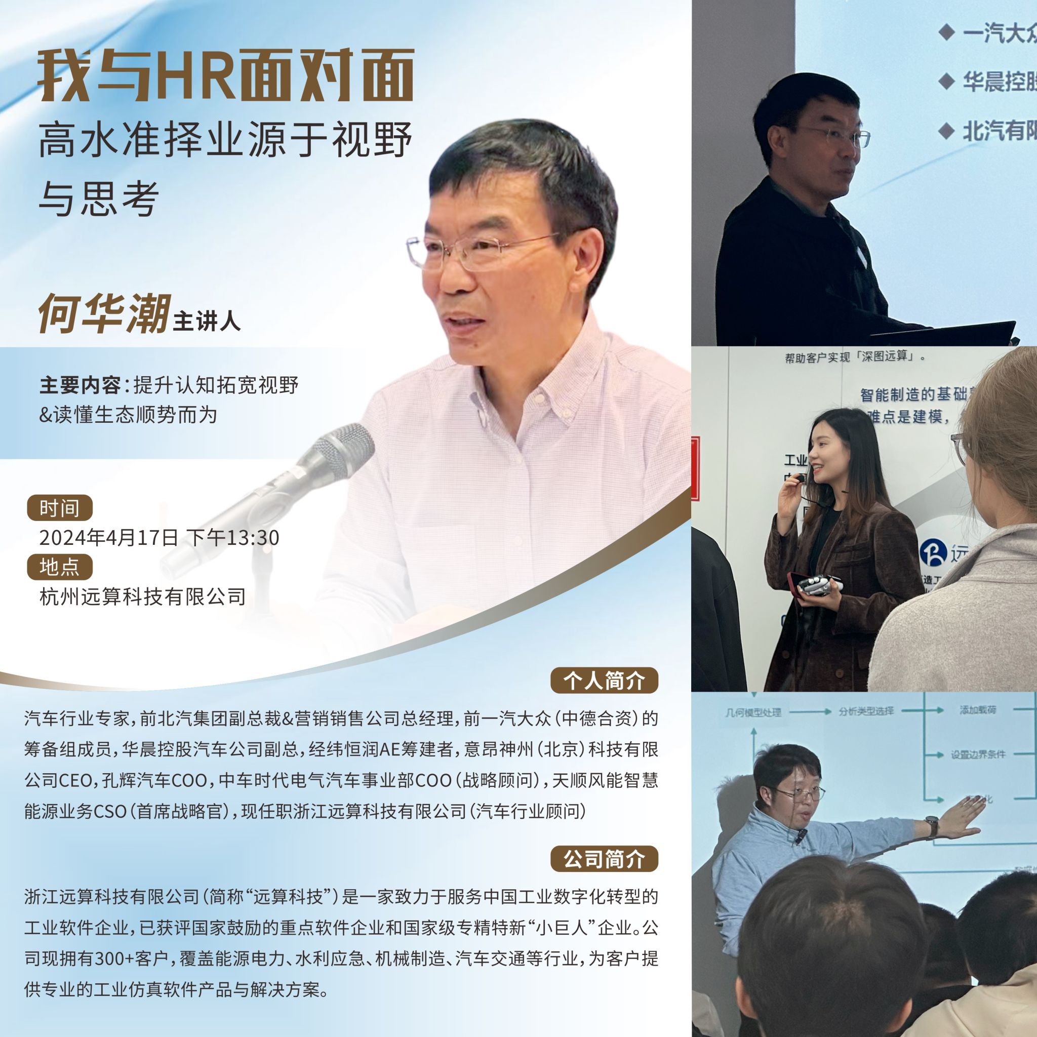 为了让同学们近距离感受企业、体验职业、了解职场生活,从而挖掘自己的职业理想,明确学习动机,做好职业规划,4月17日,“积淀讲堂”第十三讲在浙江远算科技有限公司开讲,主讲人由汽车行业专家、前北汽集团副总裁何华潮担任,学院60余名(含17位天健计划)学生参与。