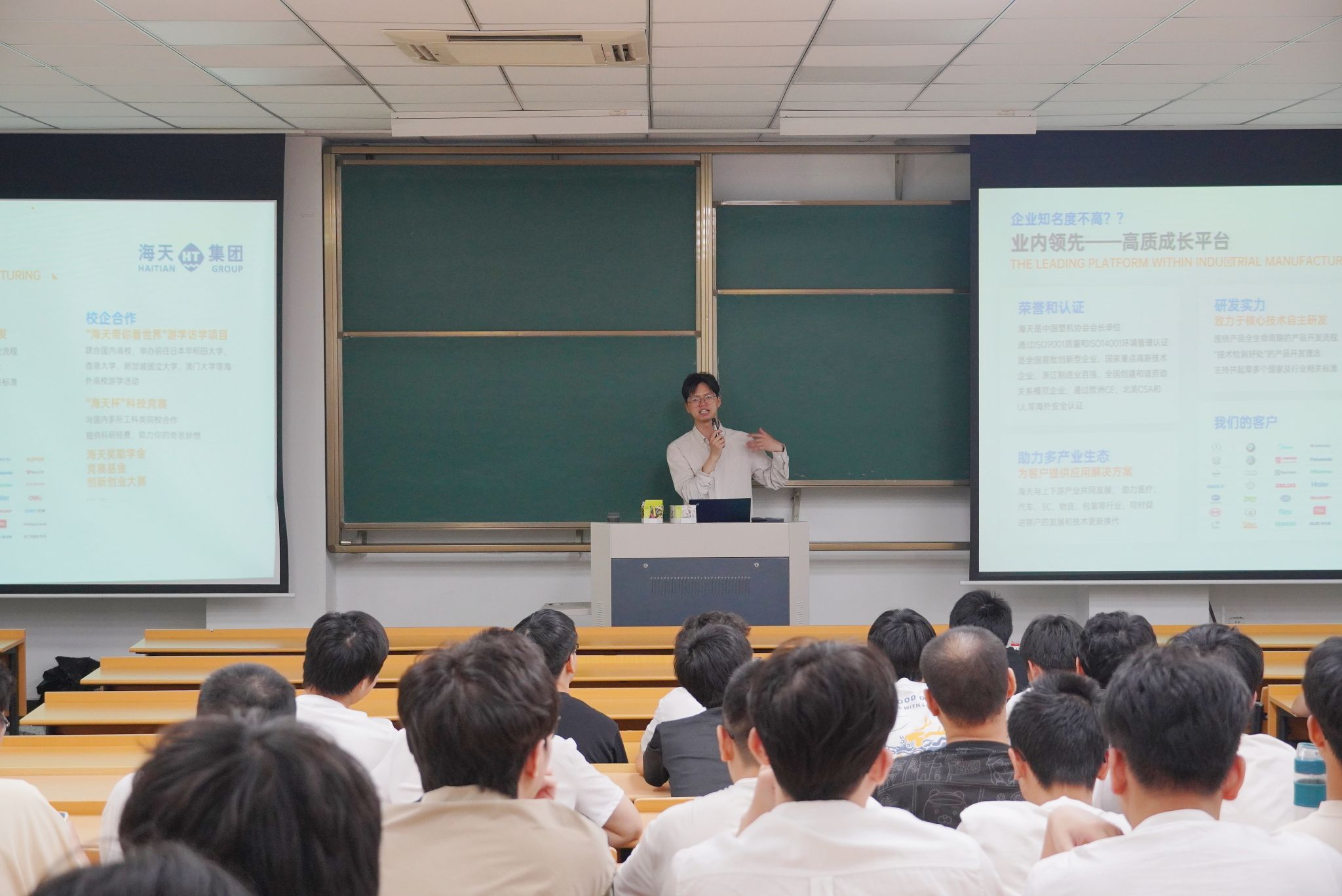 为了抢抓2025届学生求职关键期,有效拓宽实习就业渠道,促进学生更高质量更充分就业,机电工程学院于5月22日中午在翔宇楼105举办了海天集团2025届实习生宣讲会,宣讲会由海天集团校园招聘经理应鑫超主讲,120余位21级学生参加。