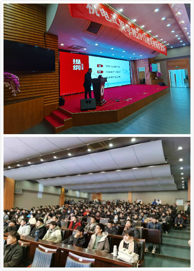 为营造良好的考研氛围,让学生进一步明确目标,增强继续深造的决心和信心,12月17日中午,机电工程学院在闻厅二楼报告厅组织召开了2018级考研动员宣讲会,研究生院研究生招生主管潘星、机电学院党委副书记杨玉书、18级辅导员杜通波、我校校友,杭电20级在读研究生许成浩,我校20级研究生赵卓潮以及2018级全体学生300余人参加了会议。