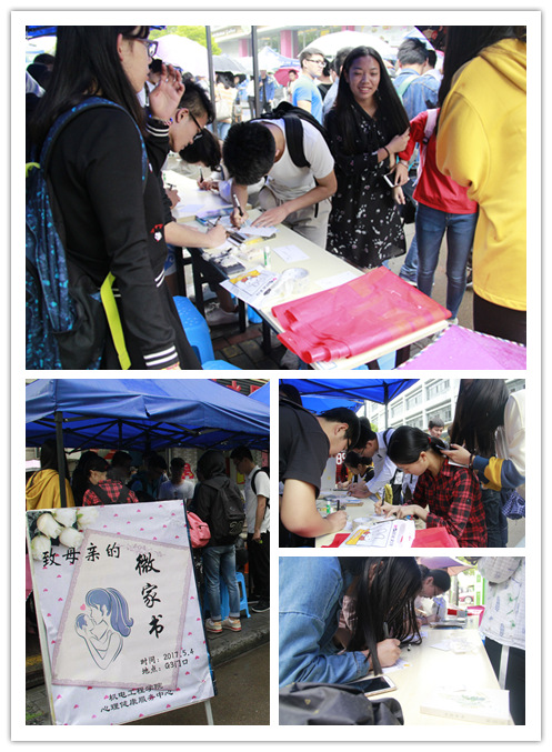母亲节,五月的第二个星期天,一个向母亲表达爱的节日。2017年5月4日中午,机电工程学院“馨约心空”心理健康工作站在G3食堂前举办“致母亲的微家书”活动,旨在发扬中国优良传统文化——感恩,帮助同学们传递心中对母亲的爱,在这初夏寄出对母亲的思念。
