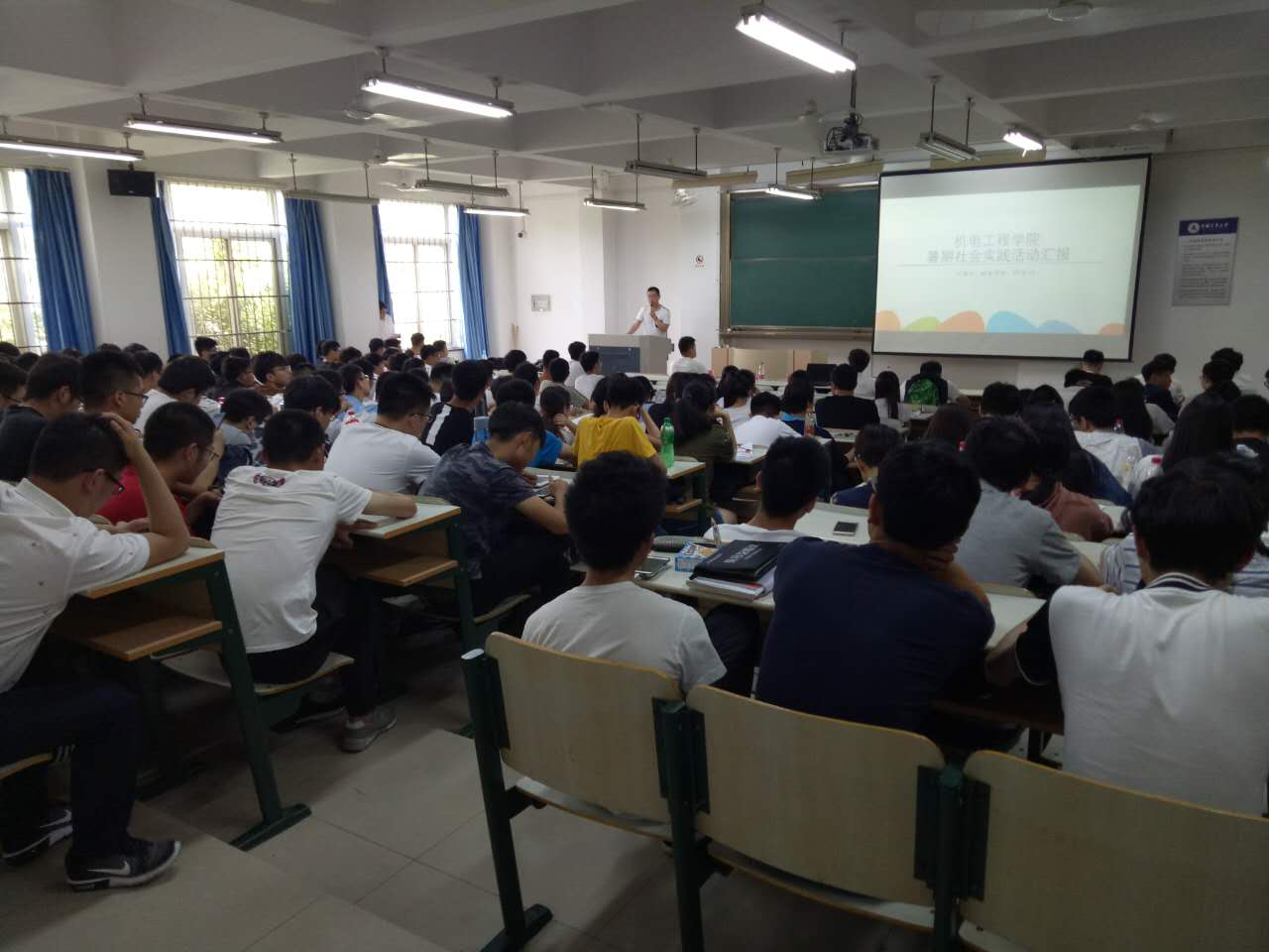 2017年5月11日中午,机电工程学院在翔宇楼103、104举办了暑期社会实践动员大会,学院团委书记周乔君、副书记杜通波、15级辅导员毛民、16级辅导员陈霞红出席了本次大会,2016级300余名同学全部参加。