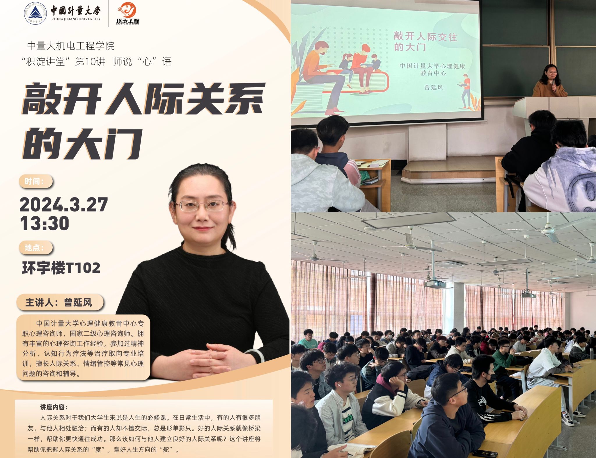 为进一步提高学生的心理素质,促进学生身心健康发展,机电工程学院在“我听名师话专业”、“我听学霸话成长”、“我听校友话未来”、“我与HR面对面”等“积淀讲堂”系列讲座的基础上推出“师说心语”专栏。3月27日,“积淀讲堂”第十讲邀请到校心理健康教育中心专职心理咨询师,国家二级心理咨询师曾延风作为主讲人开展“敲开人际关系的大门”主题讲座,230位低年级学生参会,活动由机电工程学院“馨约心空”二级心理辅导站举办,院心理辅导员潘逦瑛主持。