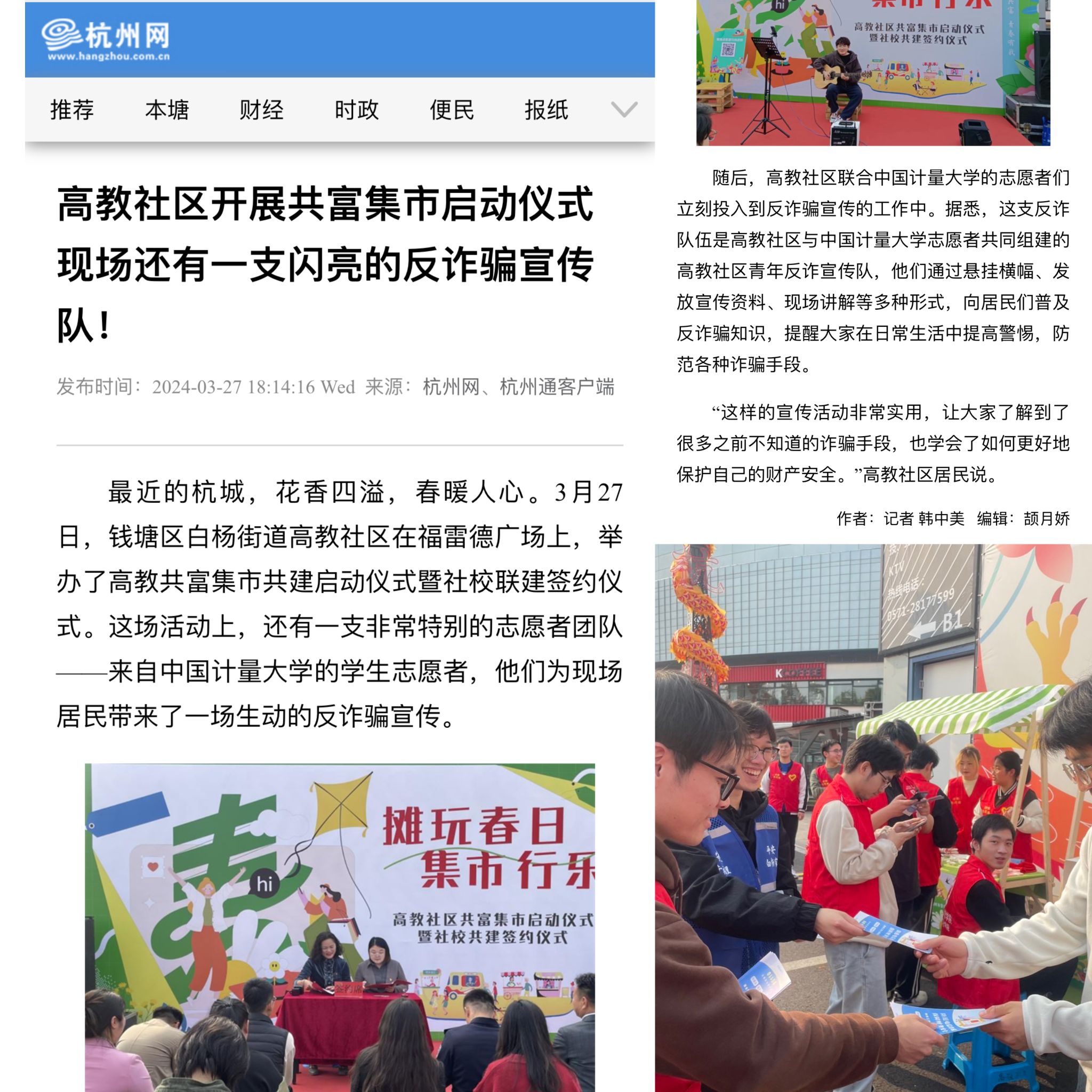 活动现场,学院组织员芮慧华与高教社区负责人签署党建共建协议。未来,双方将以党建共建为基础,在更多领域展开深度合作。随后,研究生第五党支部的学生党员化身机电“小齿轮”志愿者,为现场居民带来了一场生动的反诈骗宣传。他们通过悬挂横幅、发放宣传资料、现场讲解等多种形式,向居民们普及反诈骗知识,提醒大家在日常生活中提高警惕,防范各种诈骗手段。活动受到杭州网的相关报道。