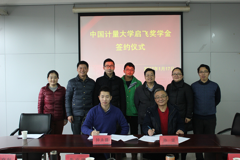 2017年1月17日,中国计量大学“启飞奖学金”签约仪式在机电工程学院仰仪南楼207举行。杭州启飞智能科技有限公司董事长钟永盛、法人郑永明(我校12机电1班毕业生)、人力资源总监陈如城(我校12微电1班毕业生),校学生处副处长王勤、机电工程学院院长孙坚、党委书记朱兆武、党委副书记刘文献、航模指导团队负责人郑恩辉、学工办主任陆维维参加了签约仪式。签约仪式由刘文献主持。