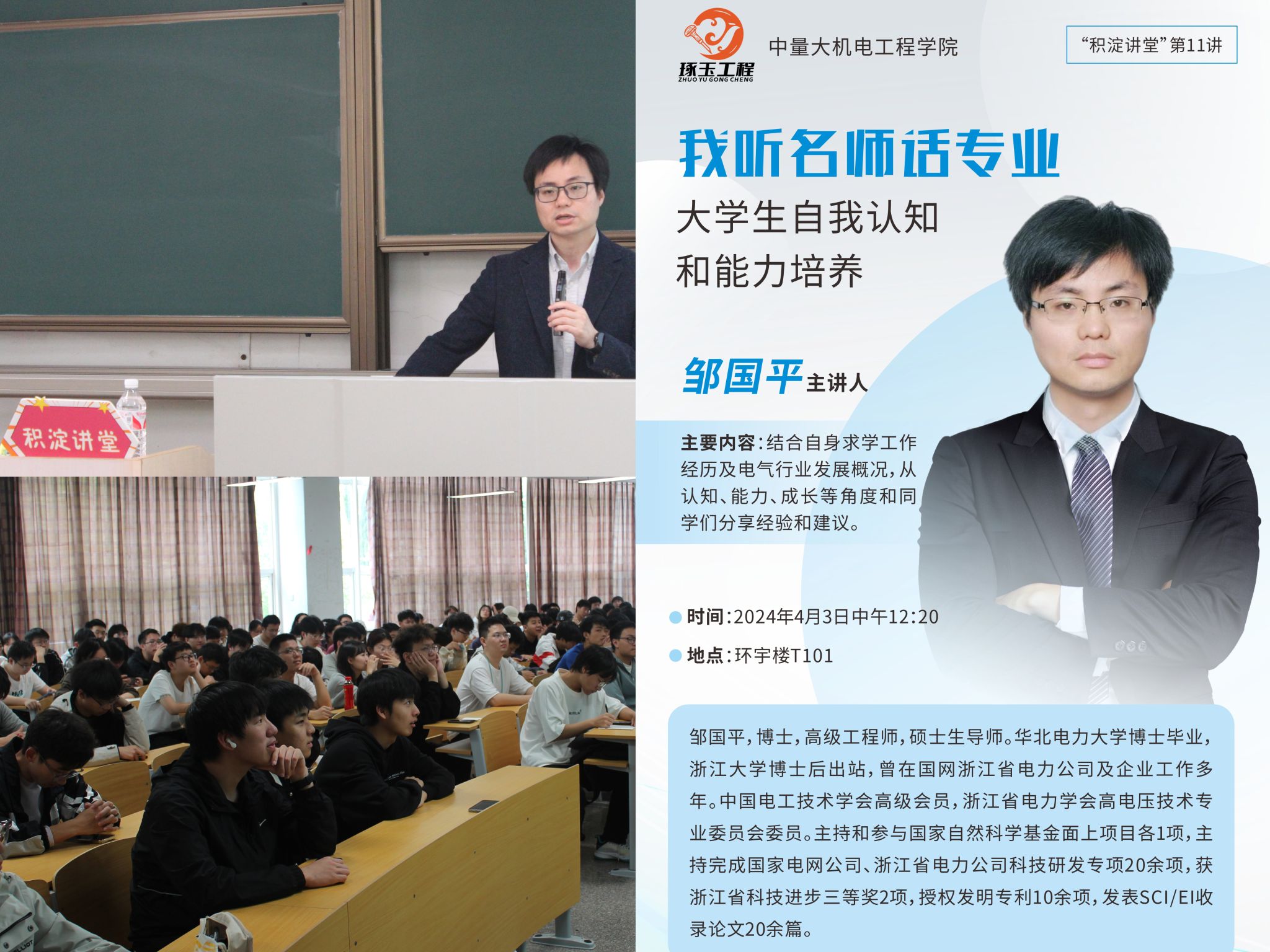 为帮助学生更好地把握行业发展前沿、明确职业方向、合理规划自己的大学生活,4月3日,“积淀讲堂”第十一讲邀请到电气工程及其自动化党支部书记,华北电力大学博士,浙江大学博士后出站,高级工程师邹国平作为主讲人开展“大学生自我认知和能力培养”主题讲座,230位低年级学生参会,活动由学院学风建设工作负责老师许程晨主持。