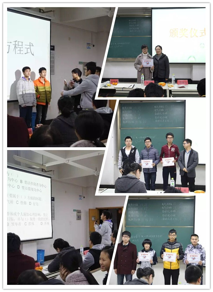 本次活动共分为了3个部分,分别为“心理知识竞答”、“心有灵犀”和“心灵鸡汤”。活动第一部分是心理知识竞赛,每个班派代表上台,然后选十道心理题目进行回答,这是实力与运气的比拼。比赛时,各班派出的代表都苦思冥想,希望能够答对为班级多拿分。各个班的表现都很不错,最后有多个班级都以同样的分数并列,竞争十分的激烈。活动第二部分是“心有灵犀”,这考验是的同班同学之间的默契,每个班选出3人代表参加,其中1人做肢体以及语言提示,其他2人猜词语,在90秒内猜出的词语多者胜利。比赛时,各班的代表都使出了浑身解数来进行提示,他们滑稽的表演也为现场观众带来了阵阵欢笑。之后是观众互动环节,同学们都积极参加互动,希望借此为自己班级加分。第三部分的比赛则是“心灵鸡汤”,这是主观题,考验的是同学们对心理问题的应对处理,各班代表队在拿到题目后都努力思考,虽然答的不是很全面,但他们的答案都基本得到了评委们的认可。这些题目让同学们思考了各种在大学生活中在可能遇到的问题,对他们今后学习生活中处理类似的问题很有帮助。在经过三轮激烈的角逐之后,15自动化1班以最好的成绩斩获一等奖,15自动化2班、15机电2班获得二等奖,15电气1班、15电气2班、15机械卓越班获得三等奖。