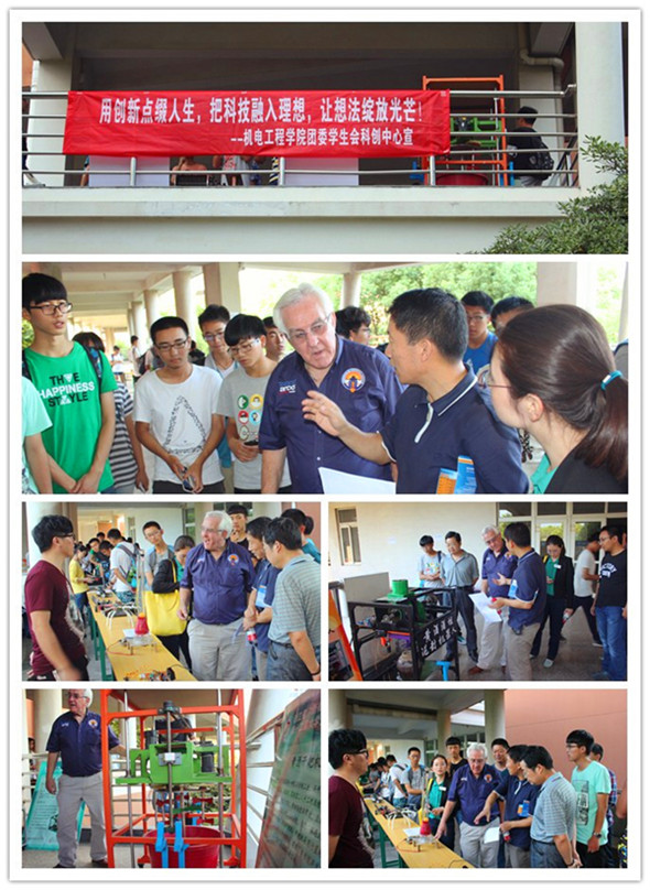 2015年9月23日下午,以“用创新点缀认识,把科技融入理想,让想法绽放光芒”为主题的机电工程学院大学生创新成果展暨新生交流会在仰仪南楼隆重举行。机电工程学院党委书记朱兆武、副书记刘文献出席了成果展。正在学院进行交流的“寻血猎犬号” (BloodHound)项目教育总监Dave Rowley和英国工程技术学会(IET)张婉在副院长严天宏的陪同下参观了成果展。此次展示交流会吸引了全院300余名师生参加。