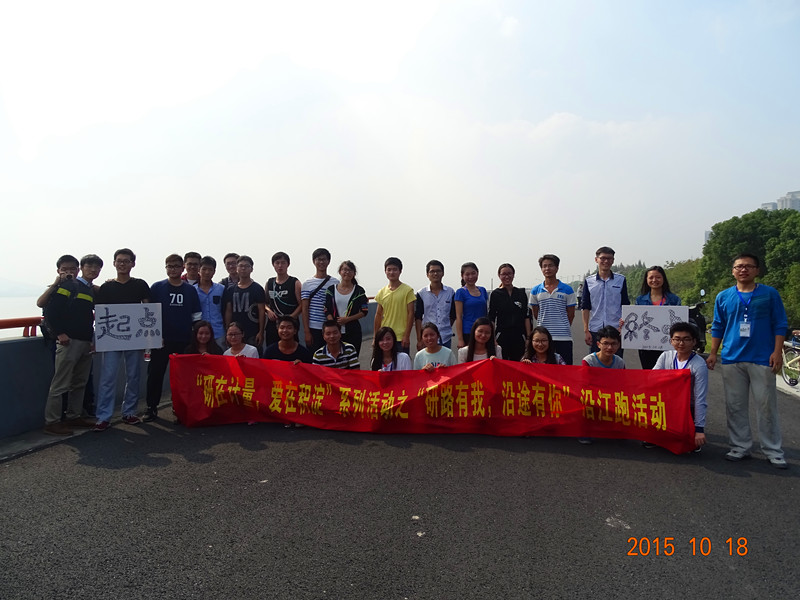 为了丰富研究生的课余活动,加强研究生之间的交流,更鼓励研究生走出寝室,走出实验室,积极参加体育锻炼,增强体魄。2015年10月18日,上午9时30分,由机电工程学院研究生会主办的“研在计量,爱在积淀之研路有我,沿途有你”沿江跑活动在钱塘江下沙区段顺利开展。