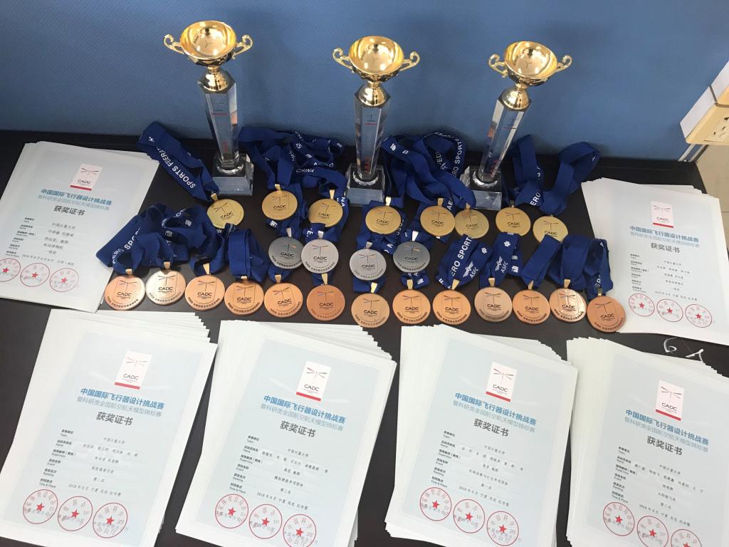 中国国际飞行器设计挑战赛(CADC),与美国举办的世界大学生航空设计大赛、欧洲大学生载重飞机设计大赛并列成为世界高校科研类飞行器设计赛三大赛事。该赛事设8个验证飞行比赛项目和科技创新评比项目。我校航模队36名队员共参加了对地侦查与打击、太阳能飞机、直升机模拟搜救、限距载重空投、垂直起降载运、电动滑翔机共6个验证飞行项目的比赛。具体获奖成绩如下:对地侦查与打击项目获得一等奖2项(单项团体冠军、单项个人季军);太阳能飞机项目获一等奖1项(单项个人季军);直升机模拟搜救项目获得二等奖1项、三等奖1项(单项团体季军);限距载重空投项目获得一等奖1项(单项个人亚军);垂直起降载运项目获得二等奖1项、三等奖1项;电动滑翔机项目获得一等奖1项、二等奖1项。特别值得一提的是,对地侦查与打击项目,继2014年后我校再次勇夺该项目团体冠军。