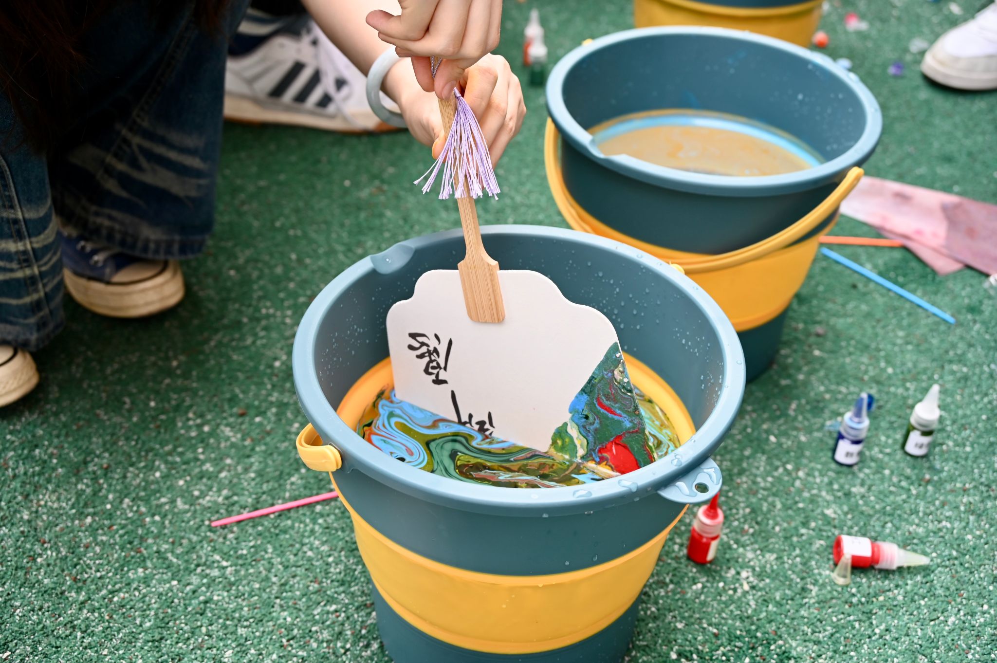 同学们在了解漆扇的历史渊源、制作工艺和艺术特色后,纷纷拿起画笔和漆料,开启了一场与古艺的对话。他们小心翼翼地在扇面上勾勒线条、描绘图案,并将扇面浸润到带有漆料的水桶里,一把把原本素白的扇子逐渐变得色彩斑斓、美轮美奂,仿佛被赋予了新的生命。