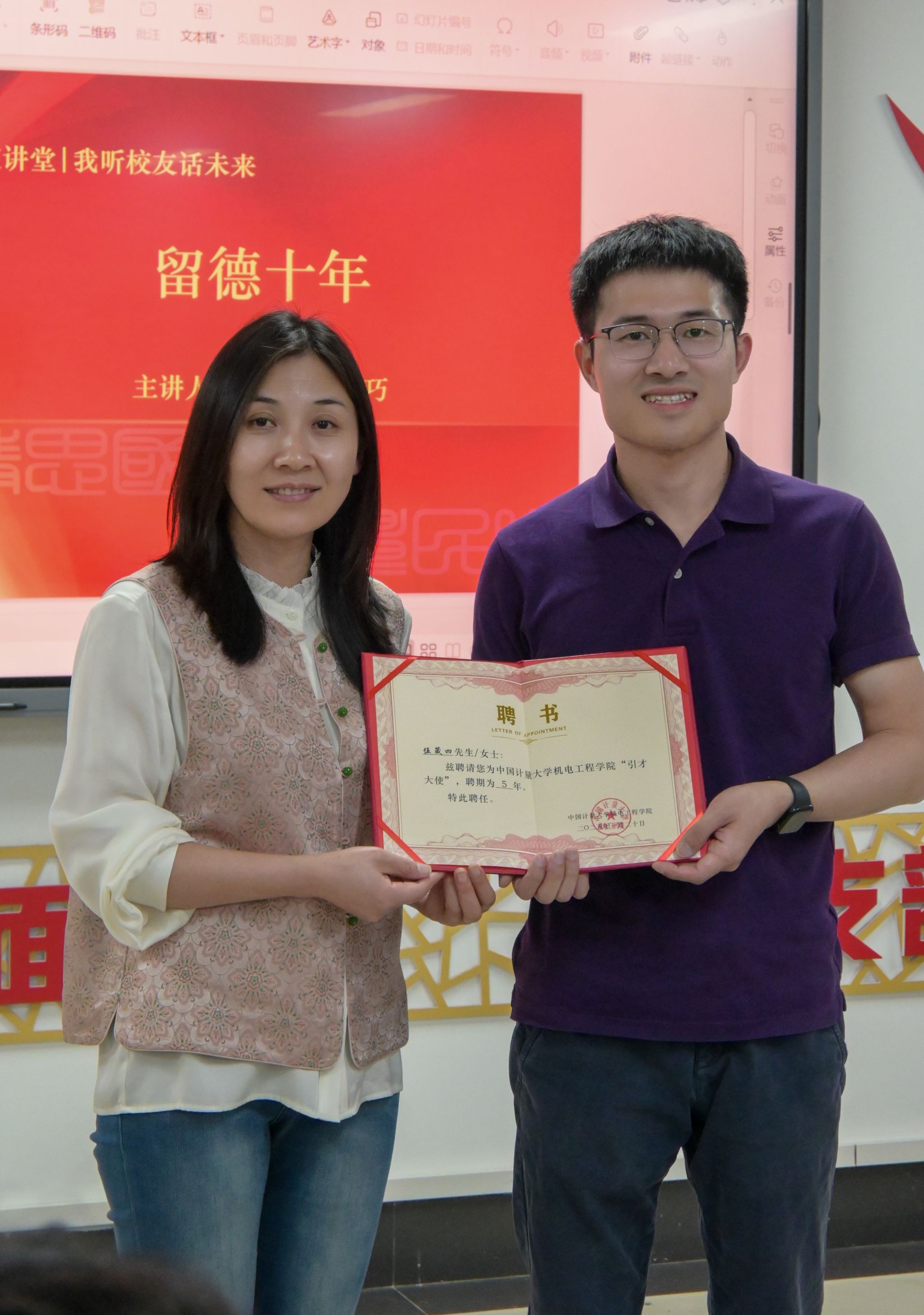 讲座开始前进行了“引才大使”聘任仪式,杨书记为校友颁发聘任证书并合影。杨玉书对校友的到来表示热烈欢迎,并强调了学院一直以来都高度重视人才引育工作,出台了人才引育工作办法,希望充分调动校内外各方力量,不断拓宽人才引育的渠道。