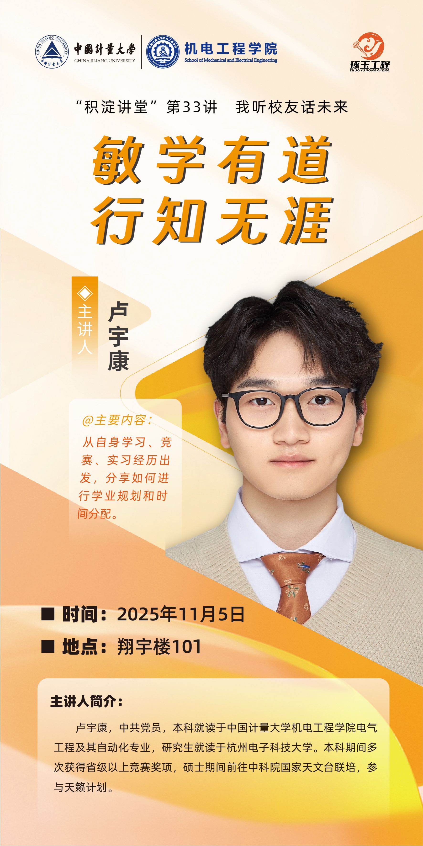 为帮助同学们破解考研与就业的选择困惑,明确大学期间的成长路径,2025年11月5日,“积淀讲堂”第三十三讲邀请到本科就读于机电工程学院电气工程及其自动化专业,后读研于杭州电子科技大学,硕士期间前往中国科学院国家天文台联培,参与天籁计划的校友卢宇康作为主讲人在翔宇楼101开展“敏学有道,行知无涯”的主题讲座,125位低年级学生和44位学院“乘风计划”学员参会,活动由学院学风建设工作负责老师许程晨主持。