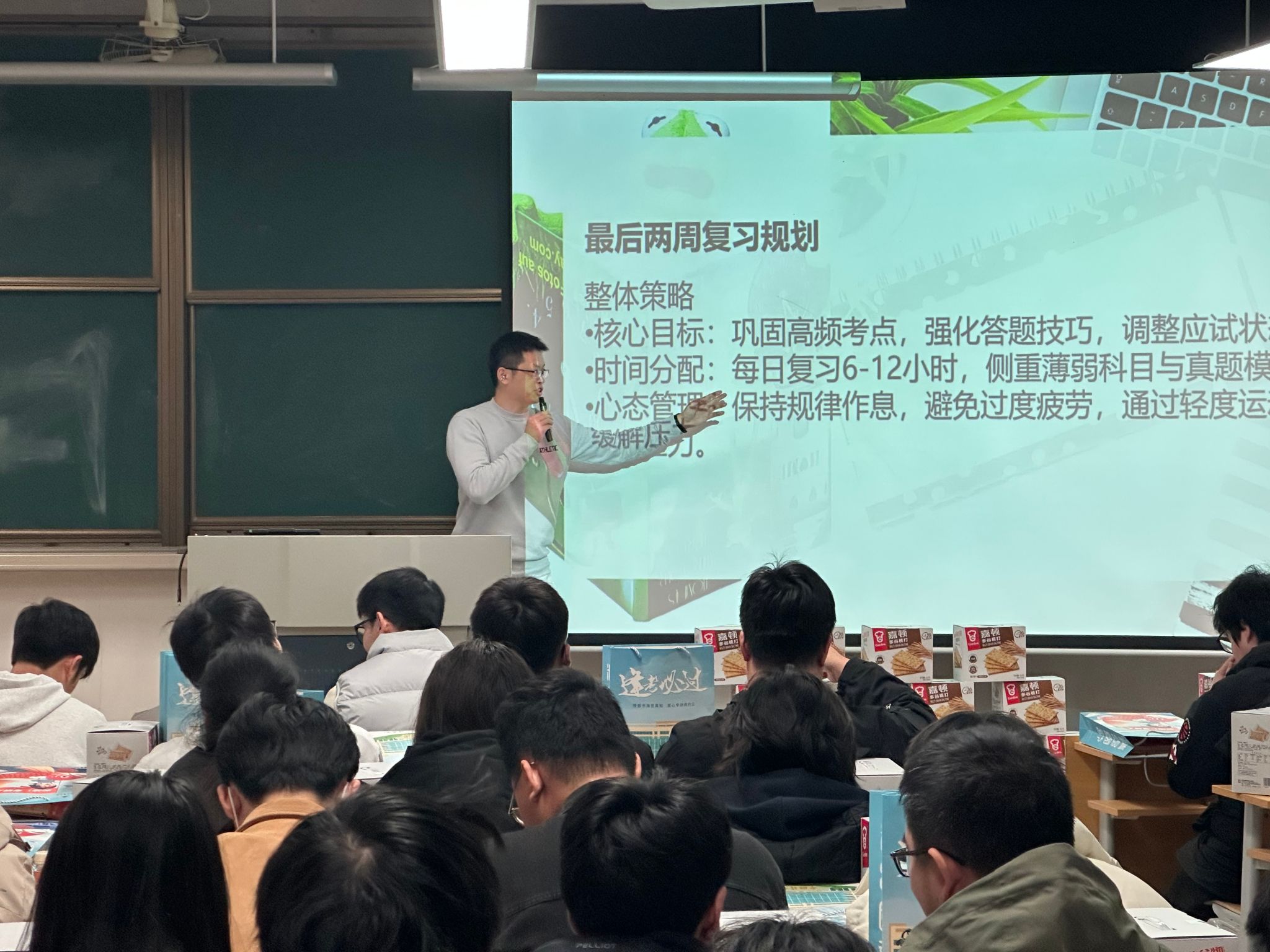 活动现场,学院精心准备的考研慰问品整齐摆放,代表着学院对考研学子的关怀慰问与殷切希望。陈子良代表学院向同学们送上真挚勉励与殷切祝福。他指出,考研之路道阻且长,却是磨砺心性品格、夯实专业根基的关键历程。希望同学们紧盯目标、凝心聚力,用扎实的备考攻克复习难点,用乐观的心态缓解备考焦虑,最终落笔生辉、一战成硕。随后毕业班辅导员杜通波针对“考前焦虑”、“复习瓶颈”等共性问题给予了指导,为全体考研学子加油鼓劲。
