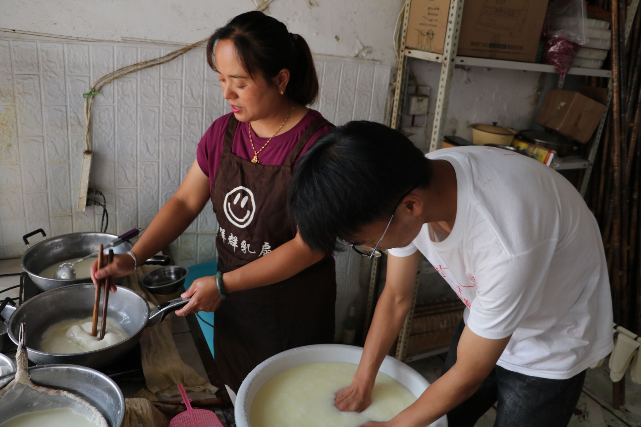 在大理,乳扇店主为“量教有为”团队成员详细介绍了乳扇的制作工艺。通过实地走访和调研,队员们知道了乳扇既是当地传统的特色食物,也是人们赖以谋生的手段。但是由于乳扇制作工艺复杂,愿意从事乳扇制作的年轻人寥寥无几,乳扇非遗文化传承存在断代的可能性。结合调研情况,团队提出以数字非遗文化为抓手,让传统乳扇制作工艺真正“活”起来,从而带动当地经济产业的发展。