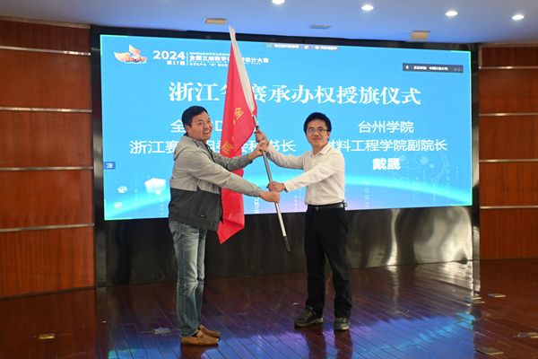 全国3D大赛浙江赛区组委会秘书长杨金林宣读了浙江省赛承办权批复函等有关文件,并举行了浙江省赛承办权授旗仪式,台州学院材料工程学院副院长戴晟代表台州学院接棋。