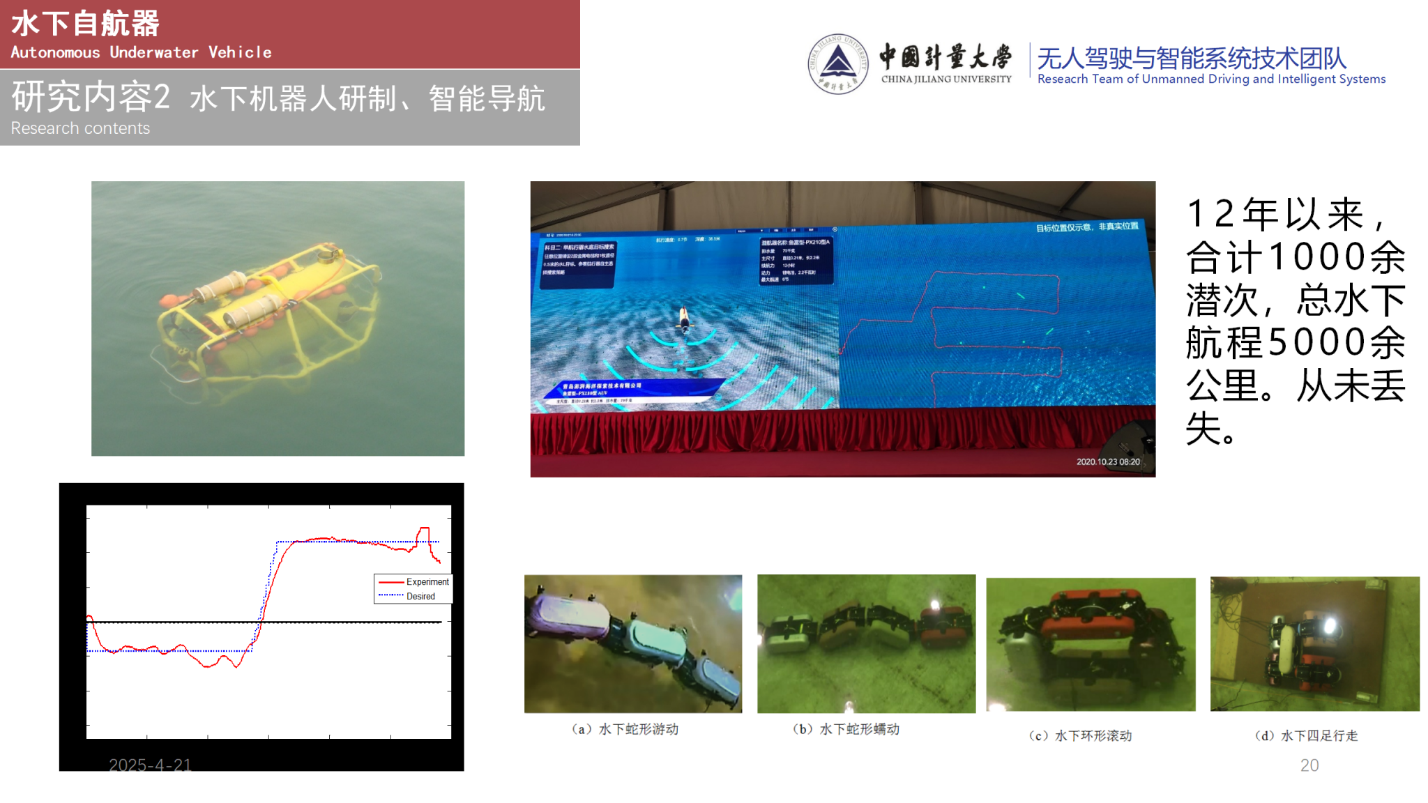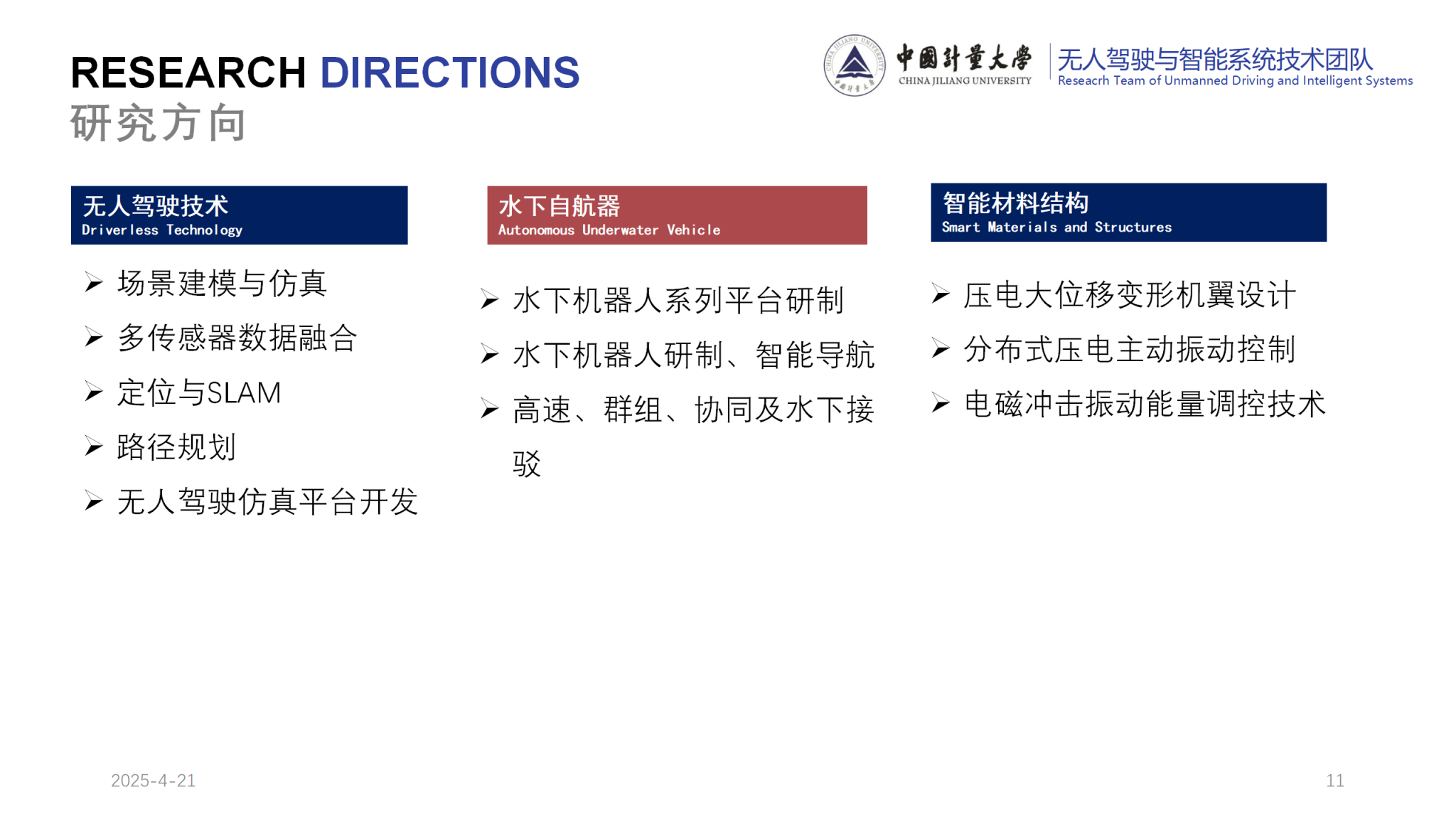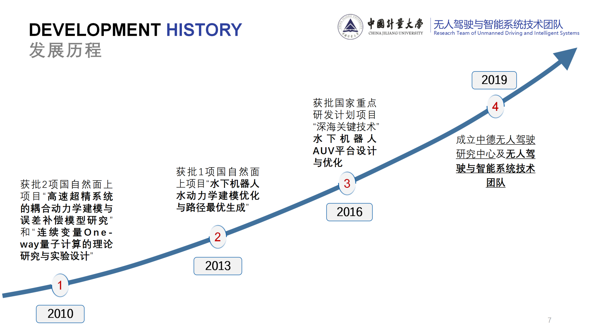 航天航空装备、海洋工程设备与先进轨道交通装备是中国制造2025重点发展领域,也是国家新工科工程的重点建设方向。在此形势下,中国计量大学无人驾驶与智能系统技术团队在2019年成立,隶属于中国计量大学机电工程学院。团队主要面向无人驾驶技术、水下自航器和智能材料结构三个方向开展研究。经过多年研究积累,在无人驾驶、水下航行高端装备等方面已具备一定的研发基础和实力。