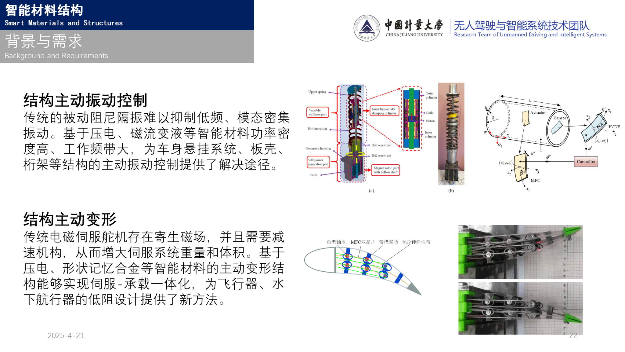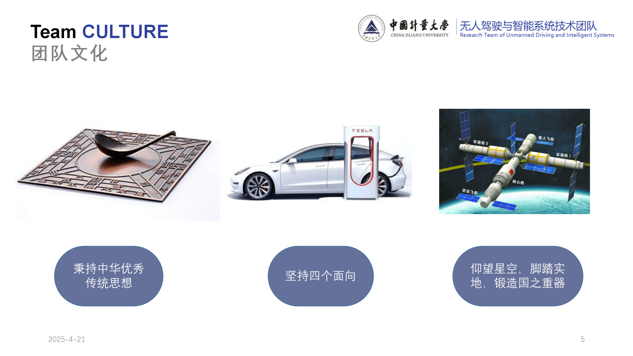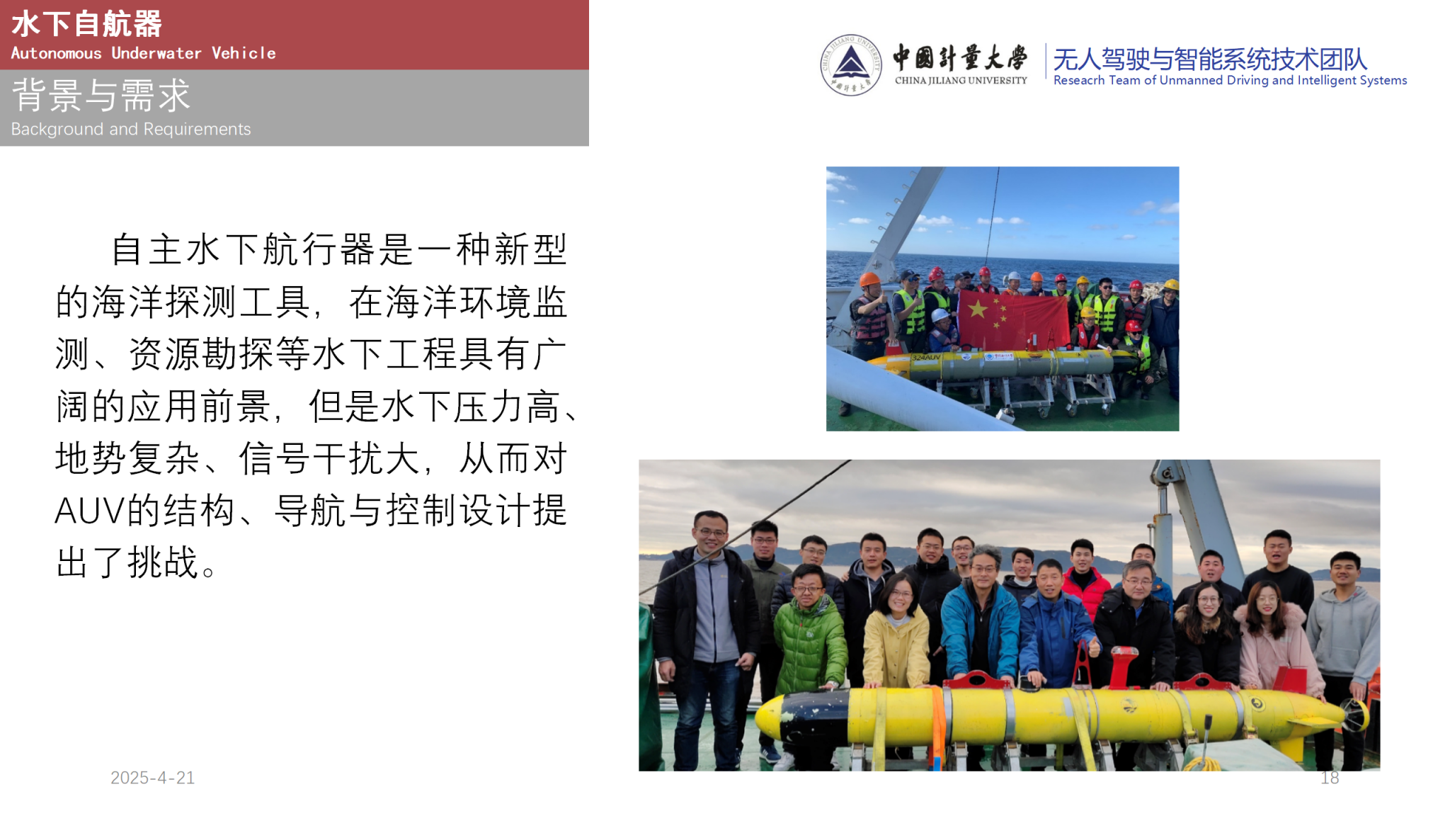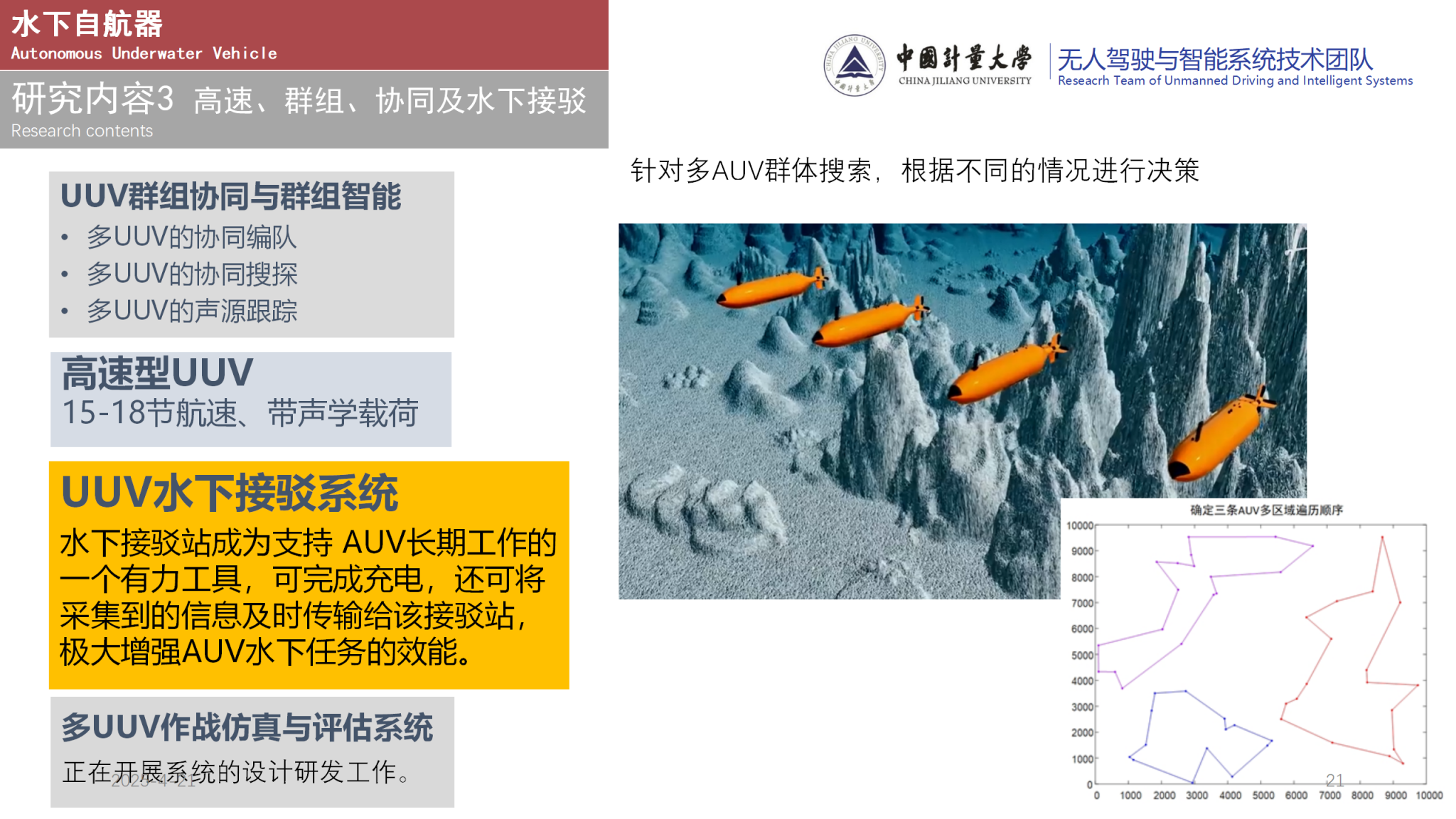 航天航空装备、海洋工程设备与先进轨道交通装备是中国制造2025重点发展领域,也是国家新工科工程的重点建设方向。在此形势下,中国计量大学无人驾驶与智能系统技术团队在2019年成立,隶属于中国计量大学机电工程学院。团队主要面向无人驾驶技术、水下自航器和智能材料结构三个方向开展研究。经过多年研究积累,在无人驾驶、水下航行高端装备等方面已具备一定的研发基础和实力。