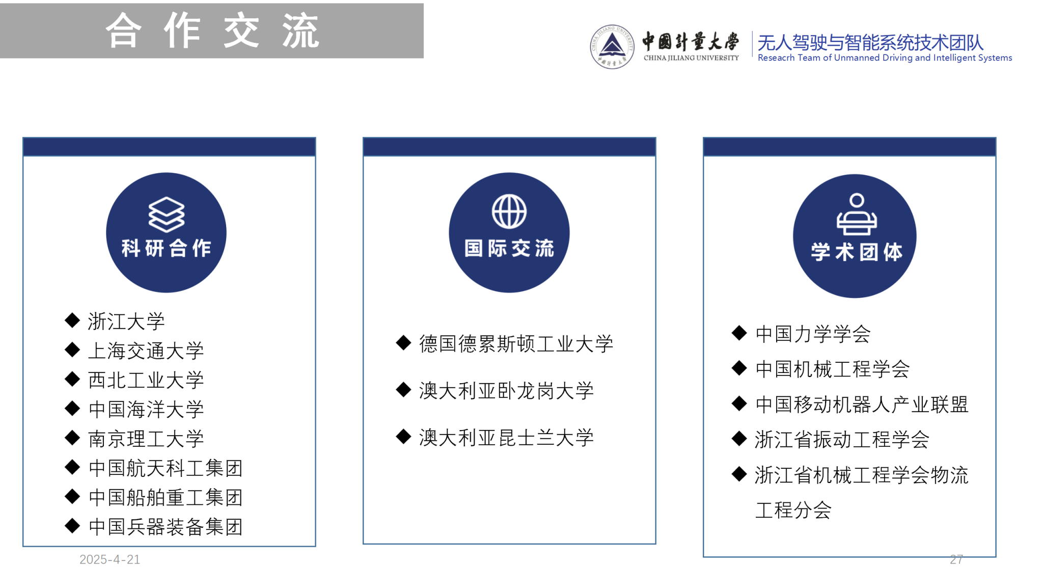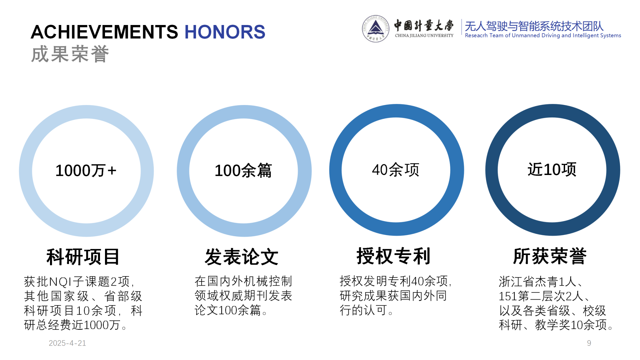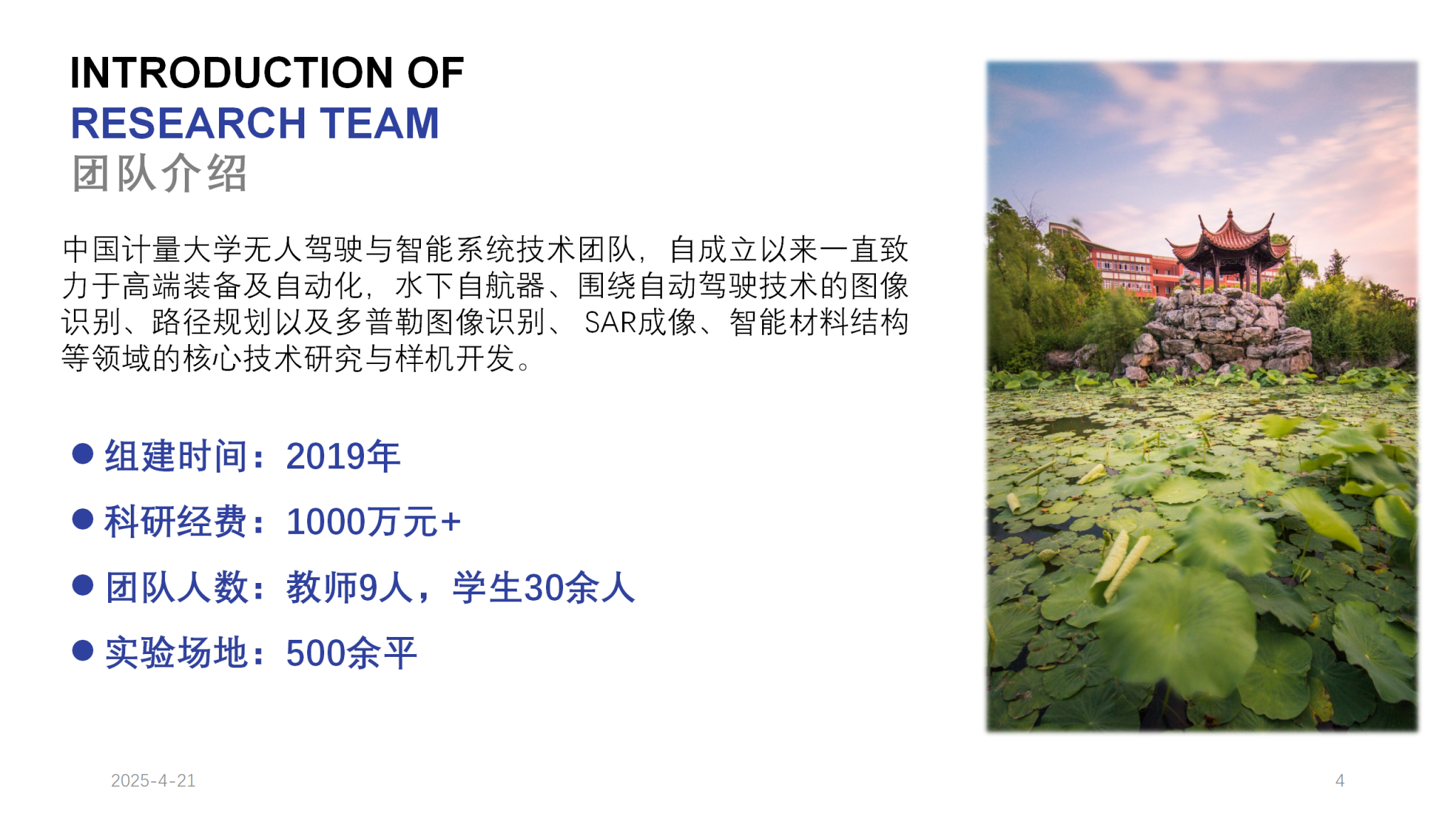 团队依托中德无人驾驶研究中心,地点位于中国计量大学西校区仰仪南楼。现拥有7名专职教师,其中教授2人、副教授1人、讲师4人以及三十余名硕士研究生。承担国家重点研发项目、国家自然科学基金、浙江省自然科学基金等省部级以上科研项目10余项,服务企业项目经费累计超过1000万元。
