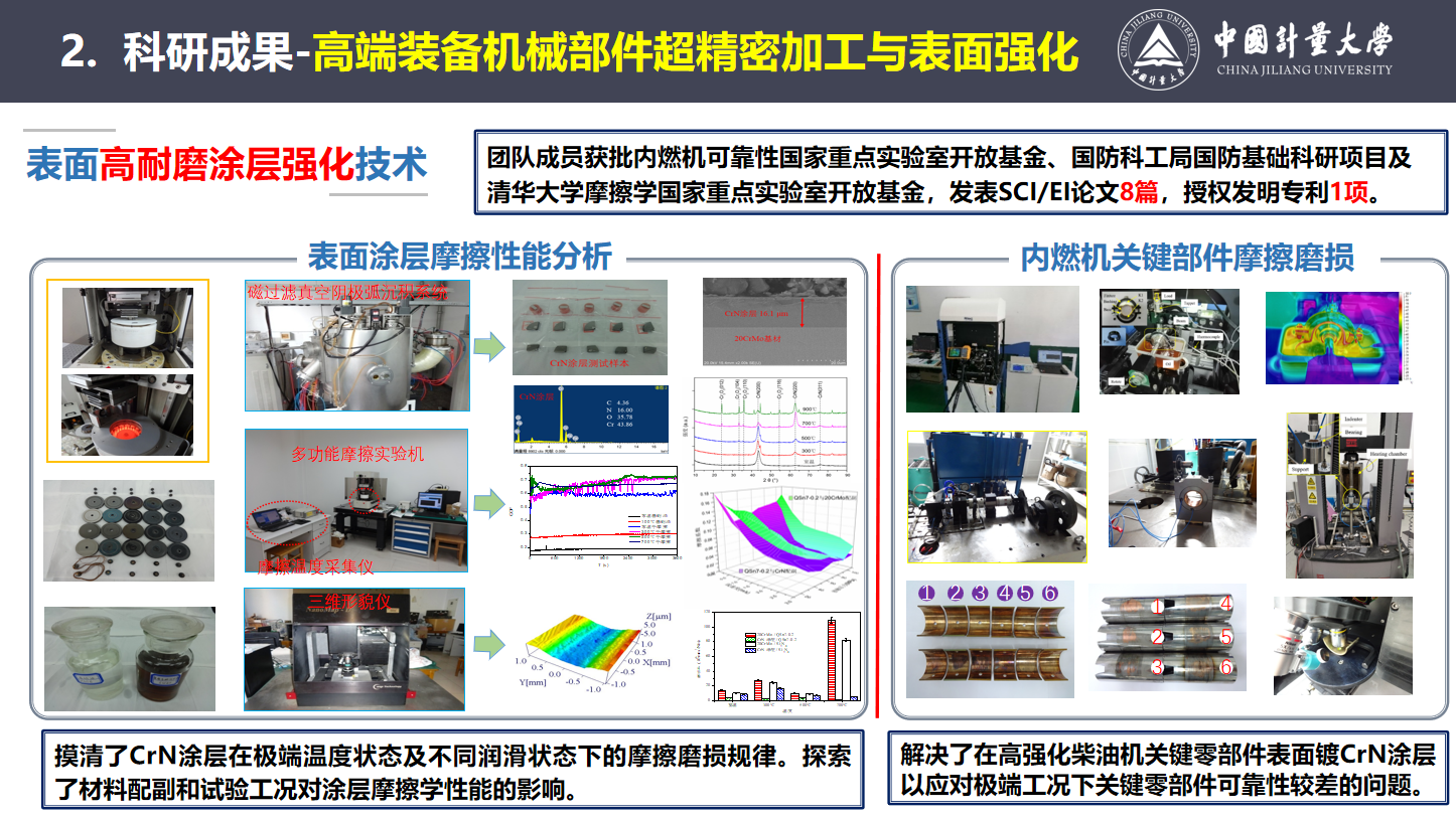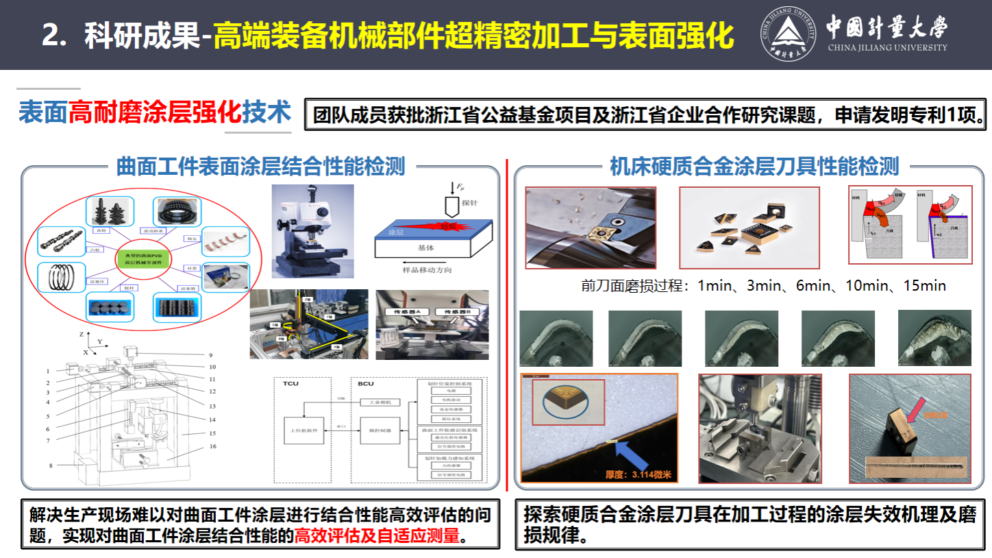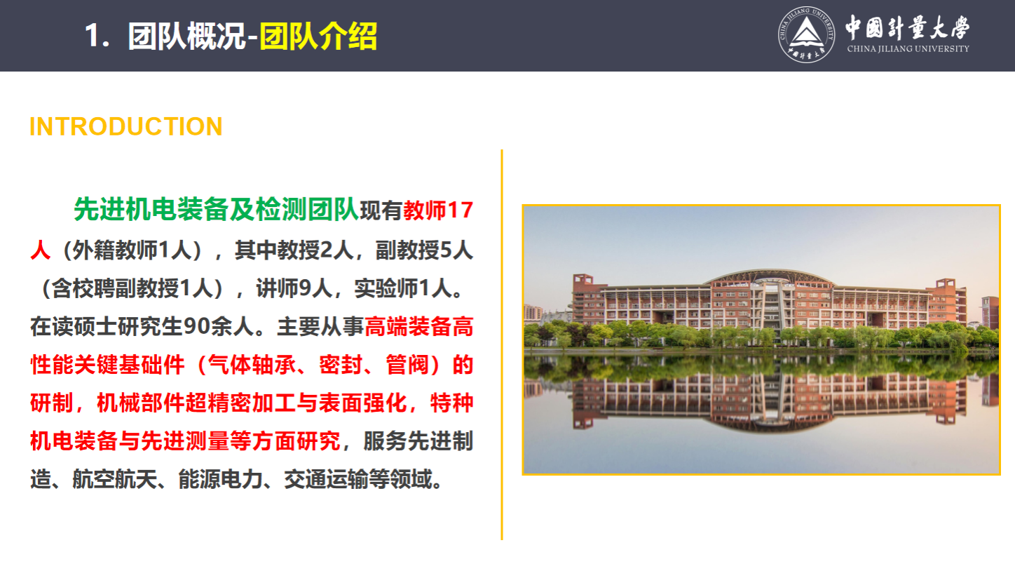 中国计量大学先进机电装备及检测团队主要从事高端装备高性能关键基础件(轴承、密封、管阀)的研制、机械部件超精密加工与表面强化、特种机电装备与先进测量等方面研究,服务先进制造、航空航天、能源电力、交通运输等领域。