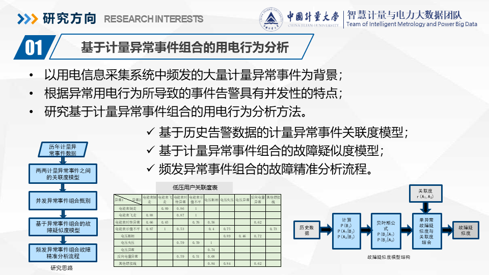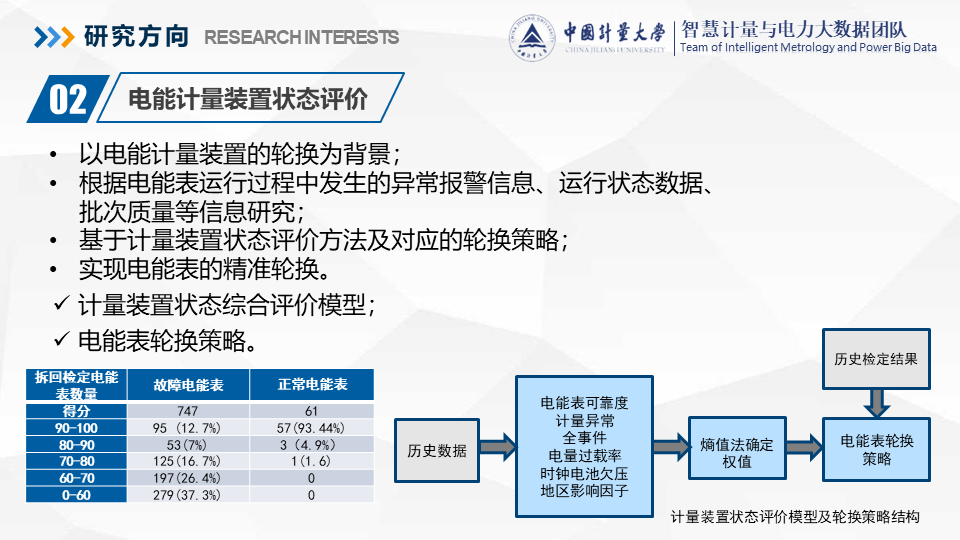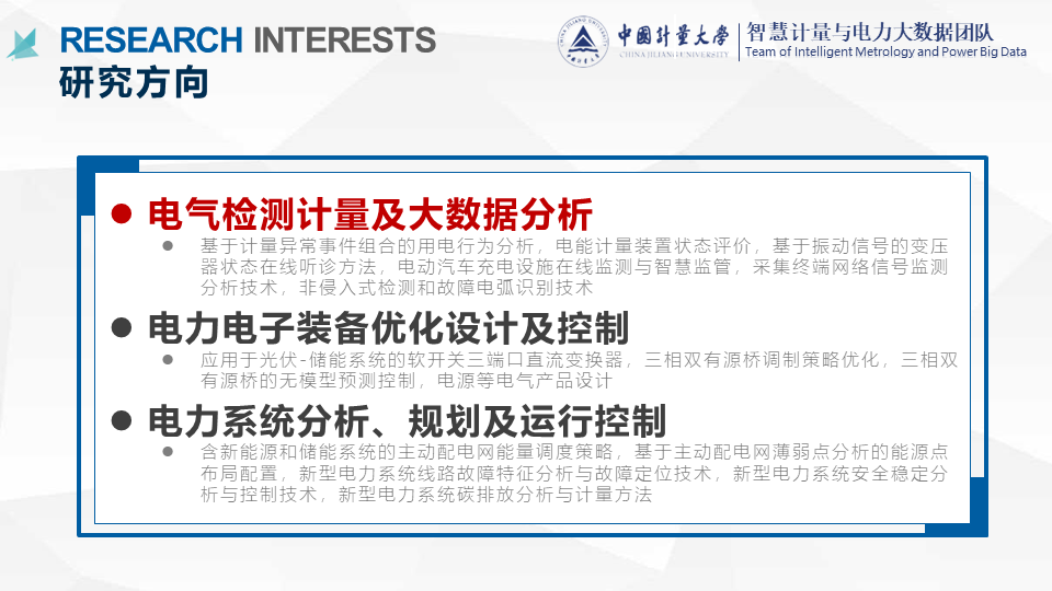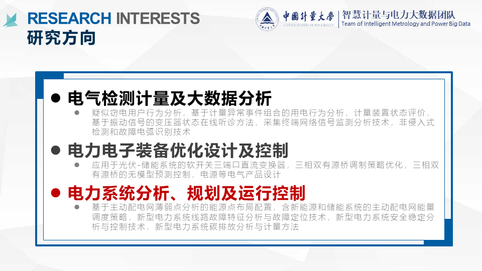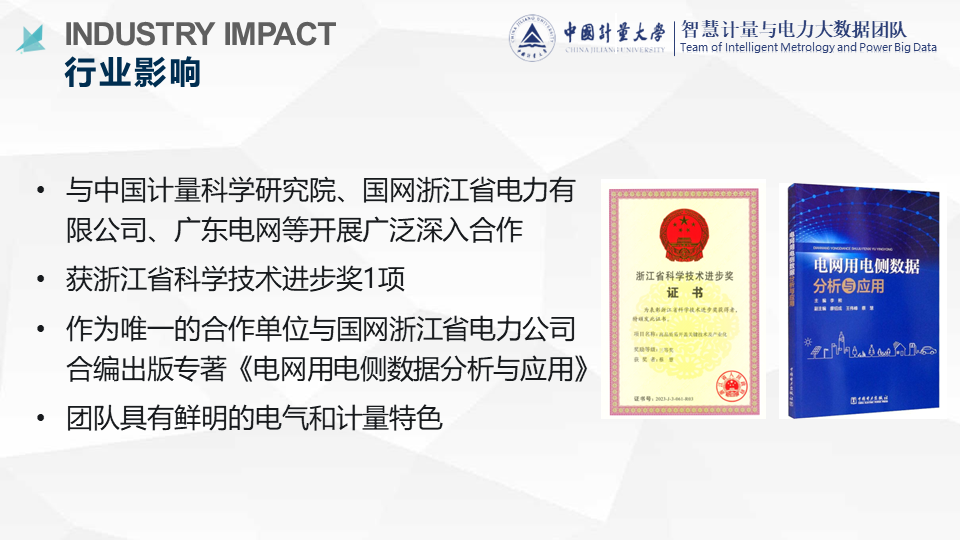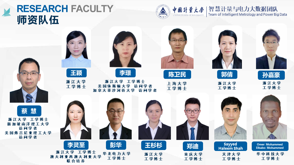 面对当前电力行业智能化和信息化的发展趋势,在新形势下发挥电参数检测和电能计量等方面的传统优势,依托中国计量大学的计量特色,智慧计量与电力大数据团队于2018年成立。团队致力于电气检测计量与大数据分析、电力电子装备优化设计及控制、新型电力系统分析、规划及运行控制等方面的研究。目前团队共有教师12人(其中教授1人,副教授3人),博士均毕业于知名高校,在读硕士研究生三十余人。智慧计量与大数据团队在计量系统及电力系统具有良好的知名度,合作单位包括中国计量科学研究院、国网浙江省电力公司、国网浙江省电力科学研究院等。
