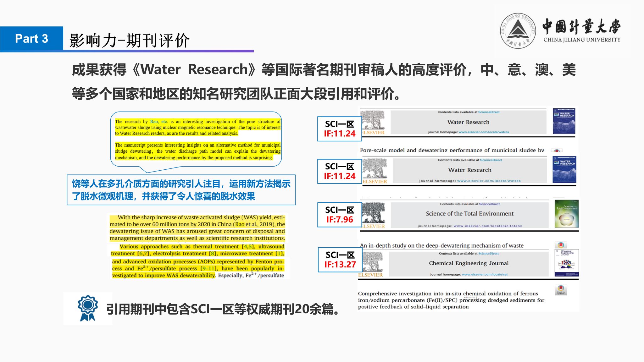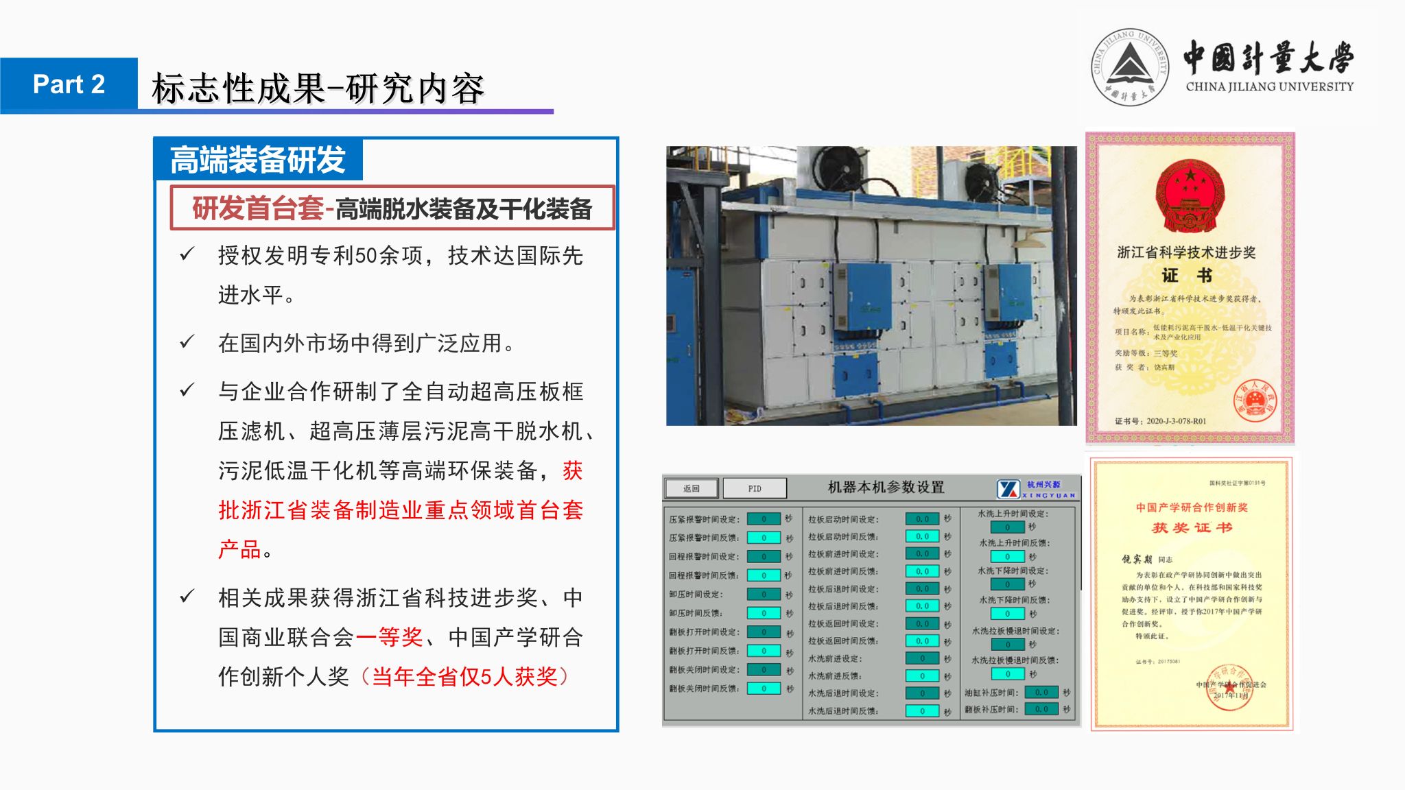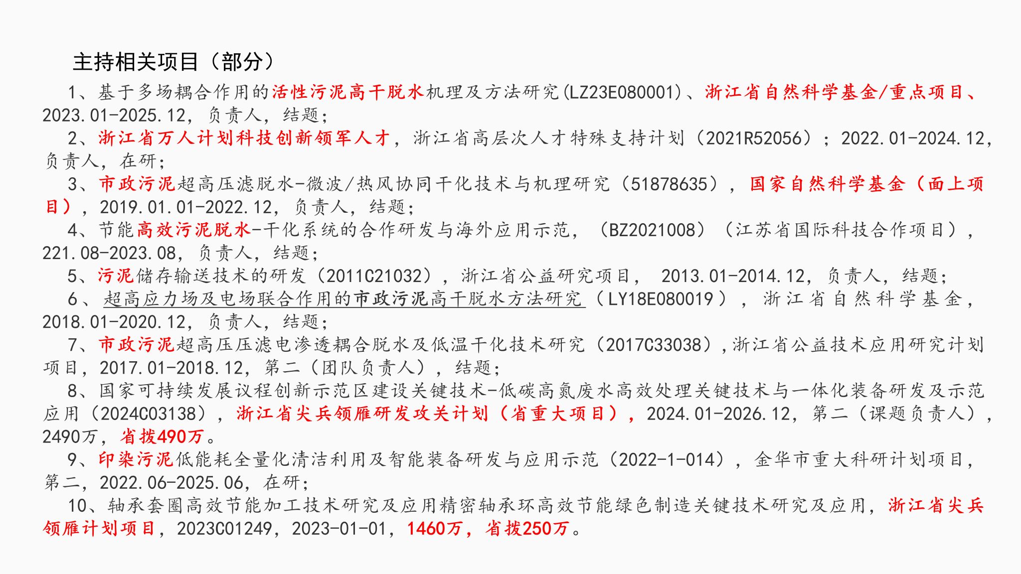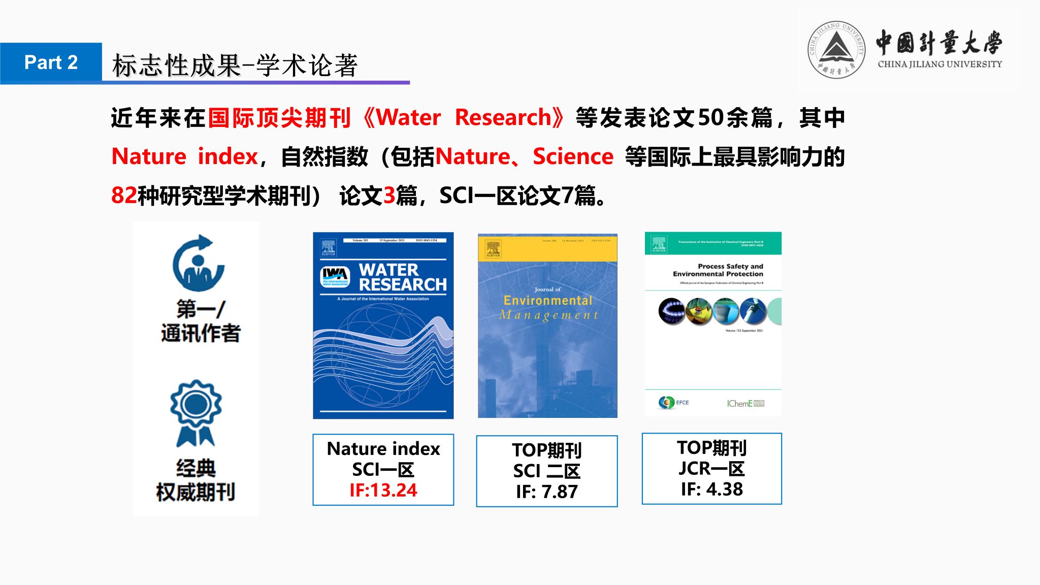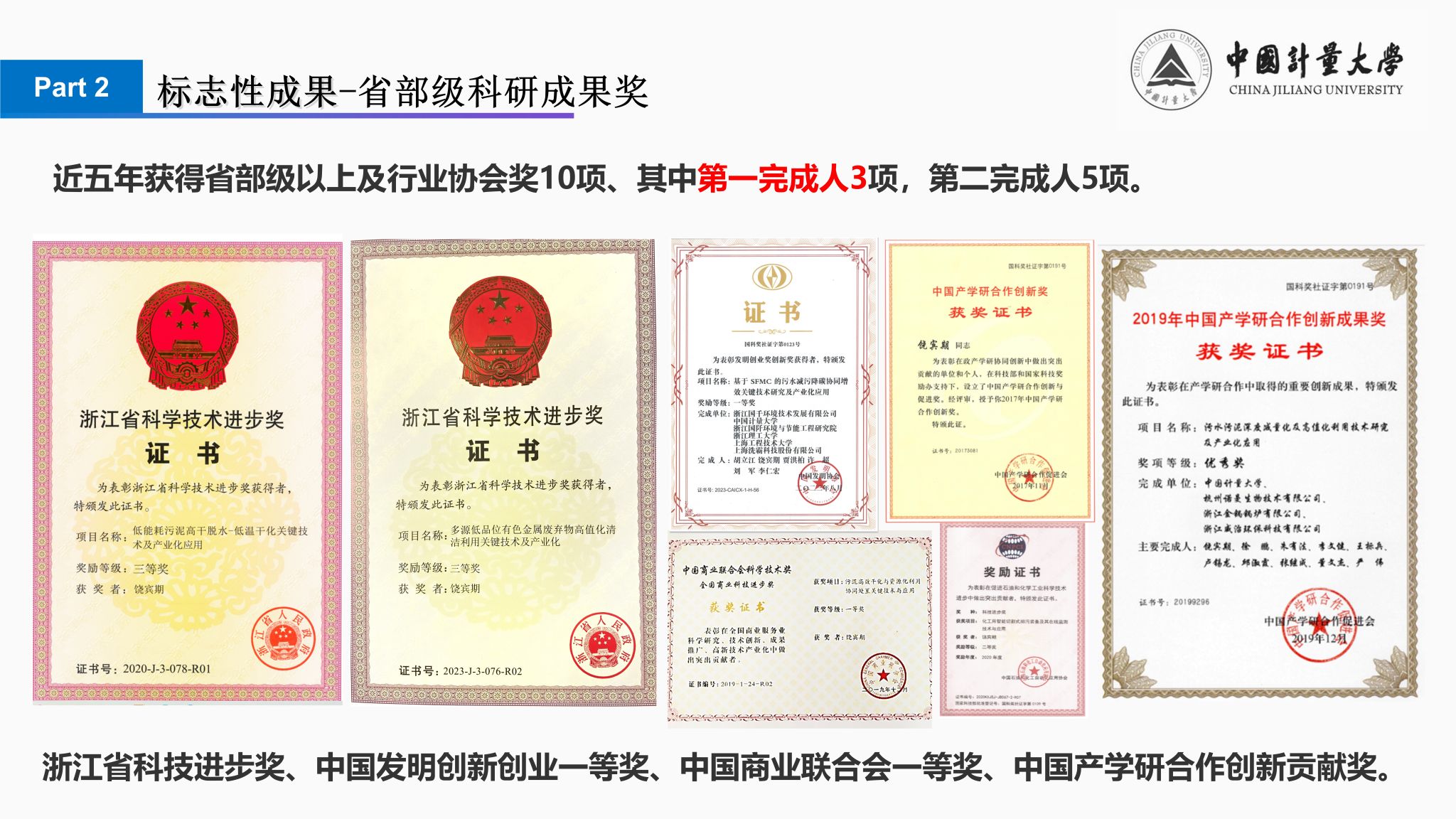 (1)获得浙江省科技奖、中国产学研创新奖、中国商业联合会科技成果奖、浙江省教学成果一等奖等各类奖项10余项;(2)承担了国家自然科学基金、江苏省国际合作项目、浙江省自然科学重点基金、浙江省领雁重点研发项目、企业委托课题等近百项,科研经费超过1500万;(3)在Water Research、Science of the Total Environment等国际顶尖期刊发表研究论文及综述60余篇;(4)获得各类专利300余项,其中美国及中国发明专利170余项。